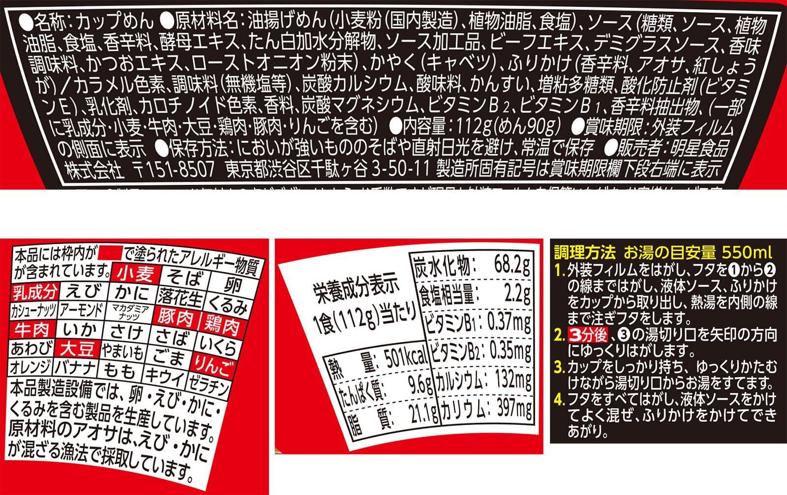 油揚げめん(小麦粉(国内製造)、植物油脂、食塩)、ソース(糖類、ソース、植物油脂、食塩、香辛料、酵母エキス、たん白加水分解物、ソース加工品、ビーフエキス、デミグラスソース、香味調味料、かつおエキス、ローストオニオン粉末)、かやく(キャベツ)、ふりかけ(香辛料、アオサ、紅しょうが)/カラメル色素、調味料(無機塩等)、炭酸カルシウム、酸味料、かんすい、増粘多糖類、酸化防止剤(ビタミンE)、乳化剤、カロチノイド色素、香料、炭酸マグネシウム、ビタミンB2、ビタミンB1、香辛料抽出物、(一部に乳成分・小麦・牛肉・大豆・鶏肉・豚肉・りんごを含む)