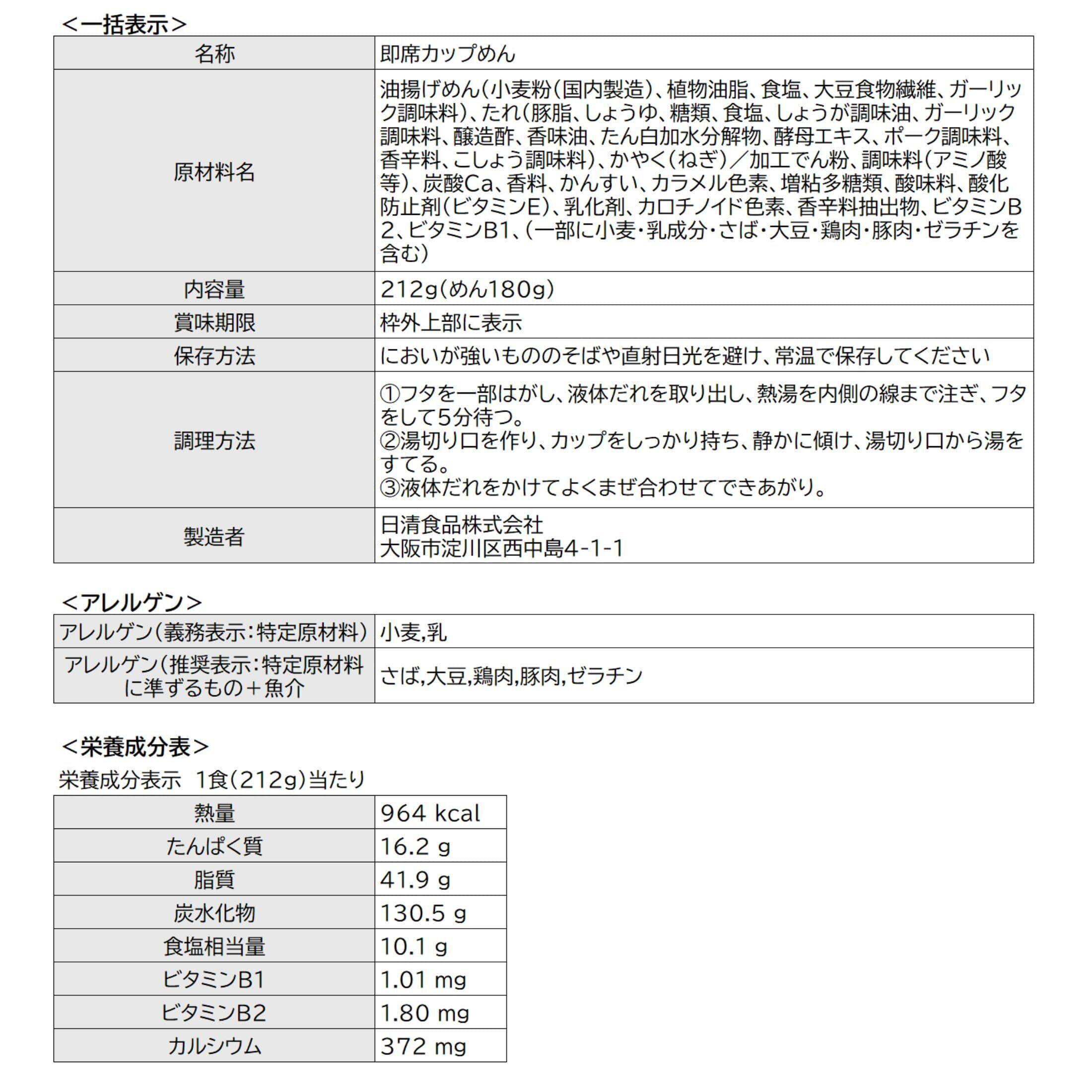 油揚げめん(小麦粉(国内製造)、植物油脂、食塩、大豆食物繊維、ガーリック調味料)、たれ(豚脂、しょうゆ、糖類、食塩、しょうが調味油、ガーリック調味料、醸造酢、香味油、たん白加水分解物、酵母エキス、ポーク調味料、香辛料、こしょう調味料)、かやく(ねぎ)/加工でん粉、調味料(アミノ酸等)、炭酸Ca、香料、かんすい、カラメル色素、増粘多糖類、酸味料、酸化防止剤(ビタミンE)、乳化剤、カロチノイド色素、香辛料抽出物、ビタミンB2、ビタミンB1、(一部に小麦・乳成分・さば・大豆・鶏肉・豚肉・ゼラチンを含む)