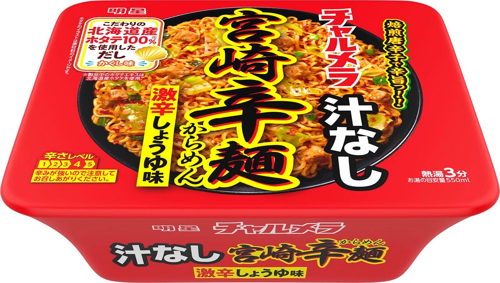 チャルメラ宮崎辛麺が汁なしで登場!唐辛子とにんにくが効いた激辛しょうゆ味。