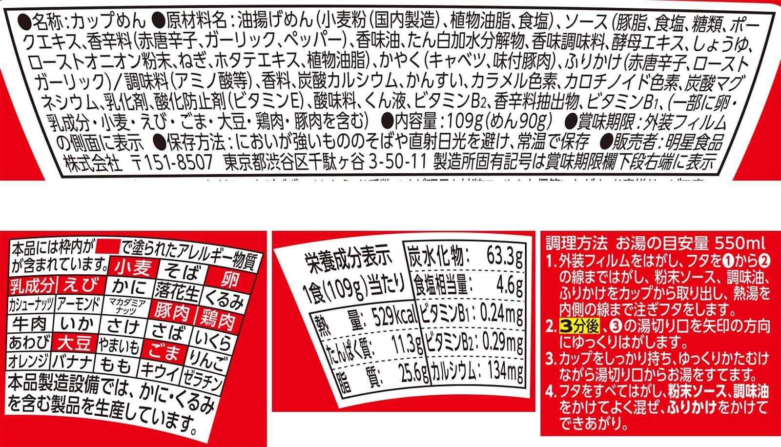 油揚げめん(小麦粉(国内製造)、植物油脂、食塩)、スープ(豚脂、食塩、糖類、ポークエキス、香辛料(赤唐辛子、ガーリック、ペッパー)、香味油、たん白加水分解物、香味調味料、酵母エキス、しょうゆ、ローストオニオン粉末、ねぎ、植物油脂)、かやく(キャベツ、味付豚肉)、ふりかけ(赤唐辛子、ローストガーリック)/調味料(アミノ酸等)、炭酸カルシウム、香料、かんすい、カラメル色素、カロチノイド色素、炭酸マグネシウム、乳化剤、増粘多糖類、酸化防止剤(ビタミンE)、酸味料、香辛料抽出物、ビタミンB2、ビタミンB1、(一部に卵・乳成分・小麦・えび・ごま・大豆・鶏肉・豚肉を含む)