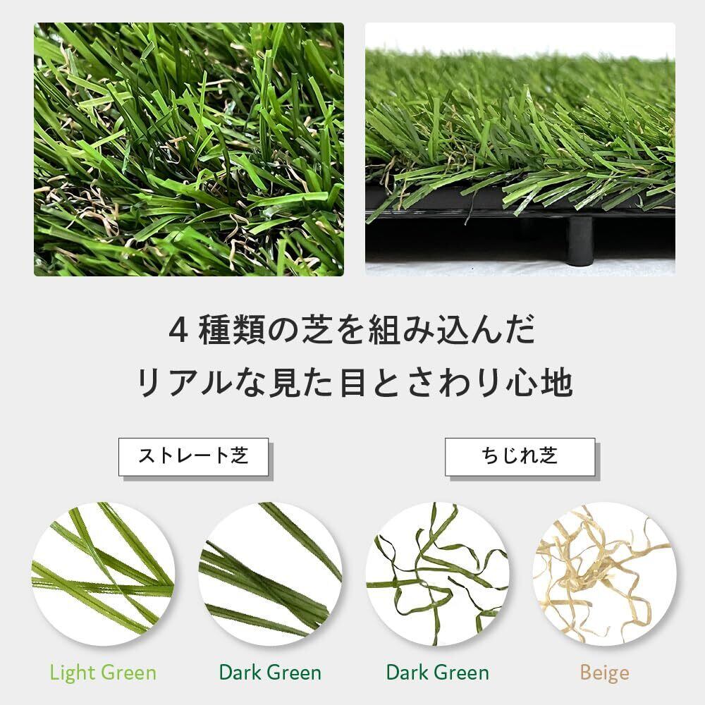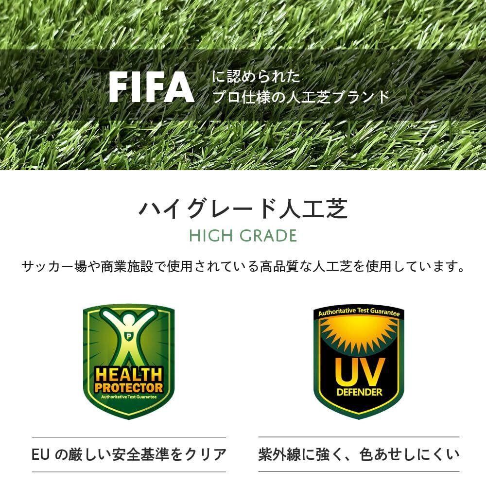 FIFAに認定された工場で作られた高品質人工芝を使用。ストレート芝とちぢれ芝の4種類の人工芝をミックスした自然の芝に近い色合い。タイルの端まで人工芝を植えているので、つなぎ目が目立ちません。