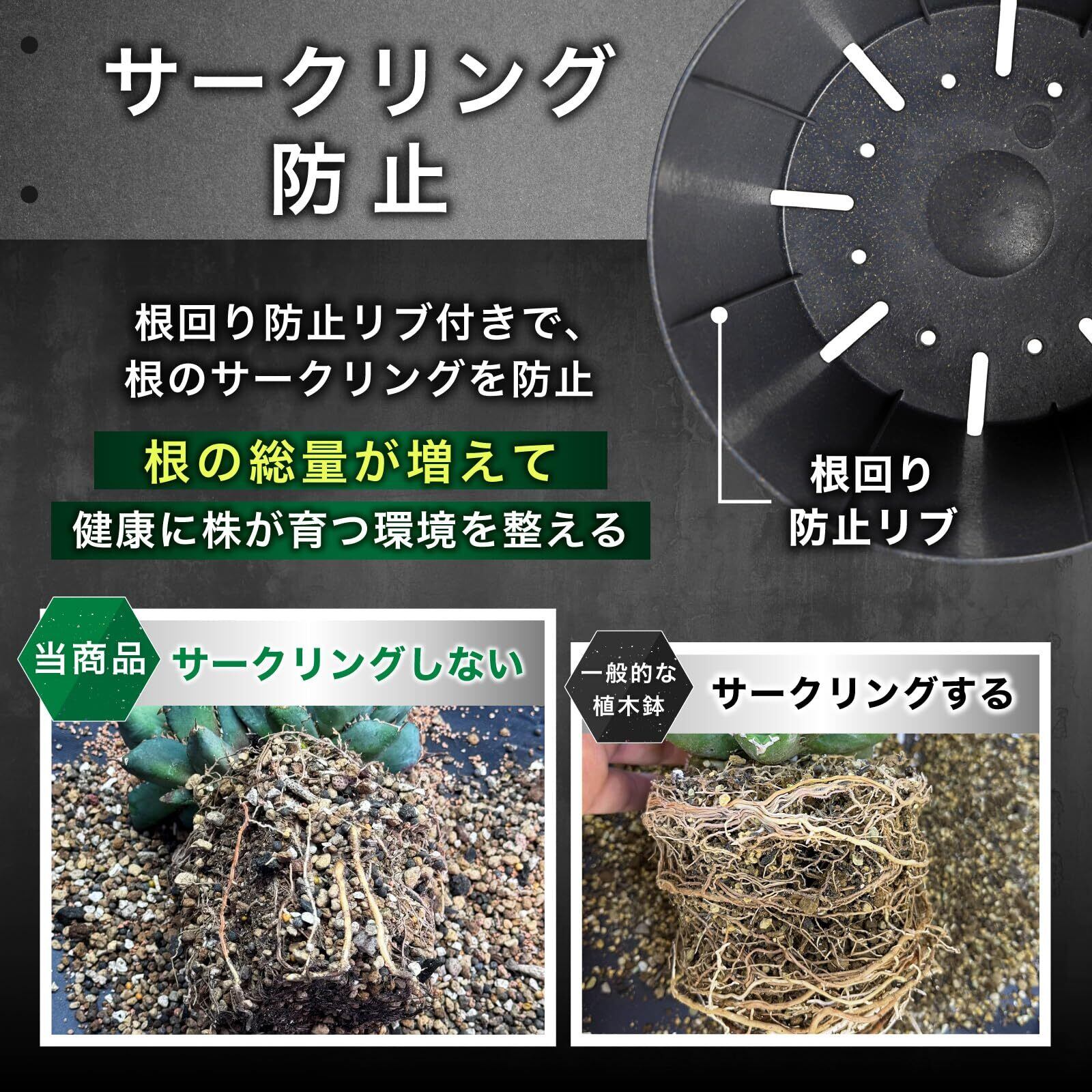 根回り防止リブが根のサークリングを防止し根の成長を促します。持ち手レス形状で鉢を並べて敷き詰めることができます。110cm*40cmのスチールラックに21個並べることが可能です。