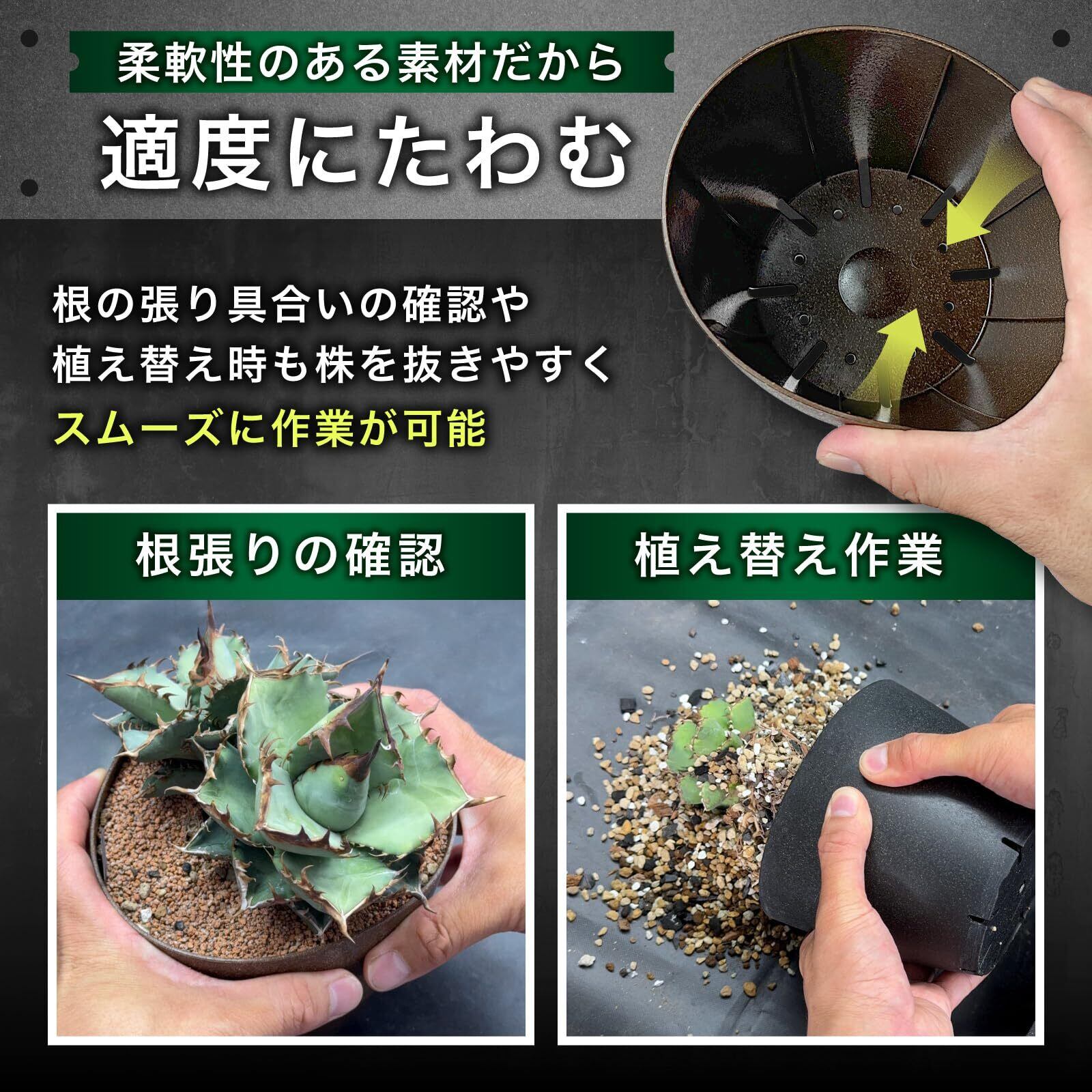 適度にたわむので、鉢の固さから根の張り具合を確認したり、植替え時に株を容易に抜くことができます。