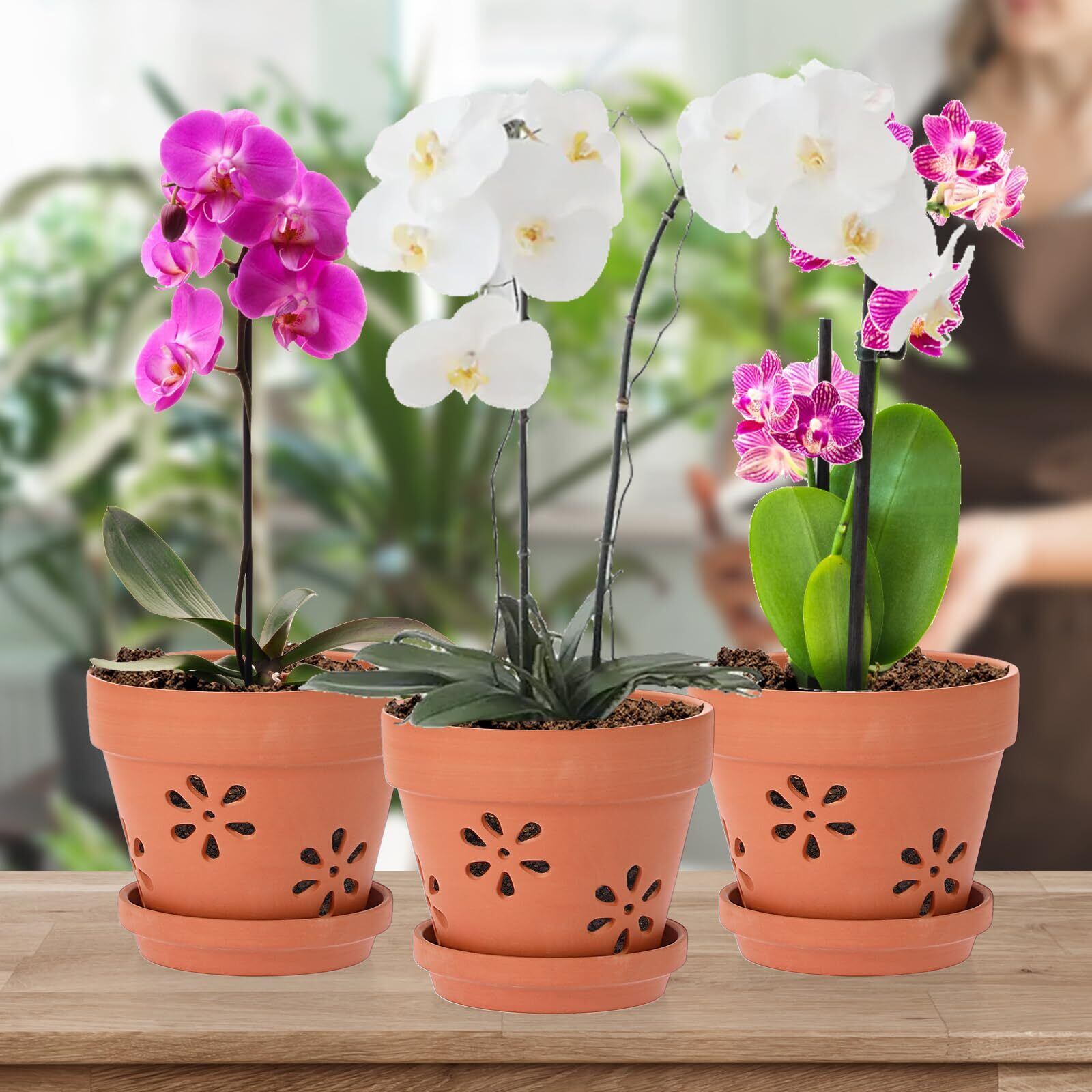 広い用途:蘭、アフリカスミレ、多肉植物、ユリ、バラ、その他の花や植物の栽培に適しています。庭やバルコニーなどの屋外、または机やテレビキャビネットなどの屋内に設置できます。素焼き鉢は芸術的な雰囲気を作り出すことができます。