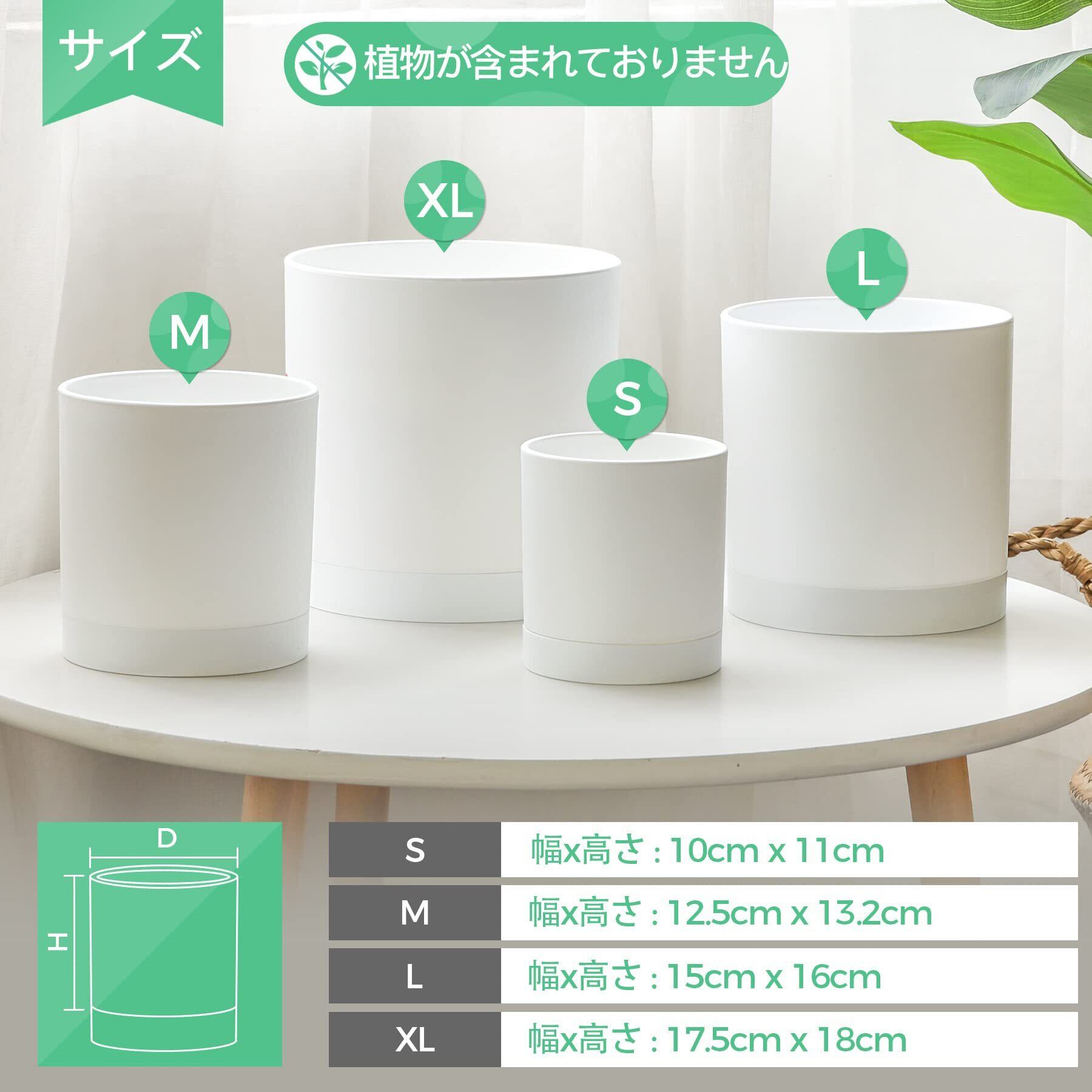 「パッケージ内容」:プラスチック製植木鉢×4(異なるサイズ);受け皿×4。下記は植木鉢の各サイズです。特大植木鉢:17.5cm×18cm(直径x高さ)。大きい植木鉢:15cm×16cm(直径×高さ)。中サイズ植木鉢:12.5cm×13.2cm(直径×高さ)。小サイズ植木鉢:10cm×11cm(直径×高さ)。注意事項:植物がパッケージには含まれません。ご注意ください。