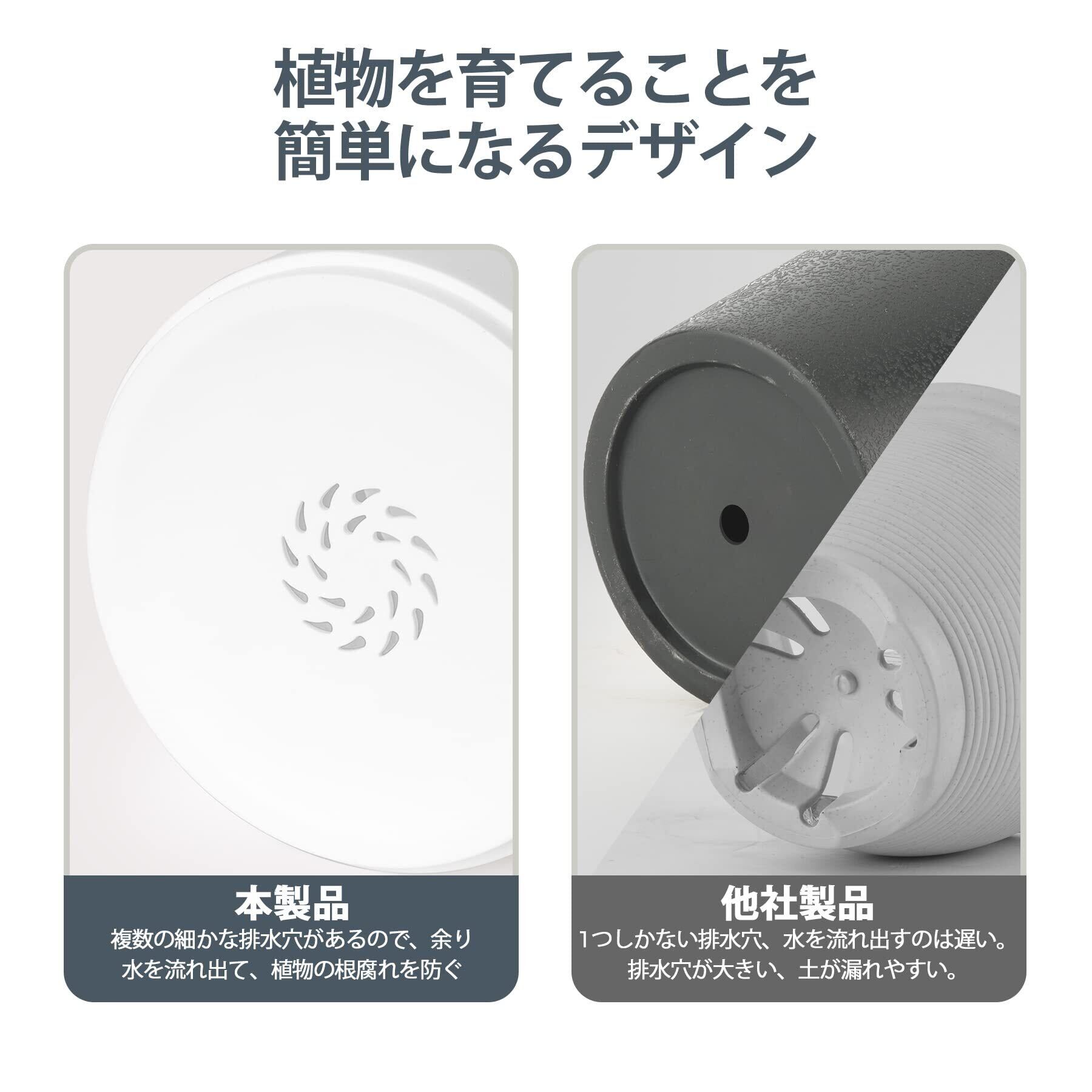 「思いやりのある排水システム」底に複数の細かな排水孔が開いているため、余り水を流れ出て、植物の根腐れを防ぐことができます。大きすぎる底穴は土漏れになりやすく、または一つだけの底穴は水はけが悪くて植物を枯らしてしまうという従来の排水孔の問題を解決しました。受け皿は簡単に取り外せますので、余った水はさっと捨てるだけでいいです。