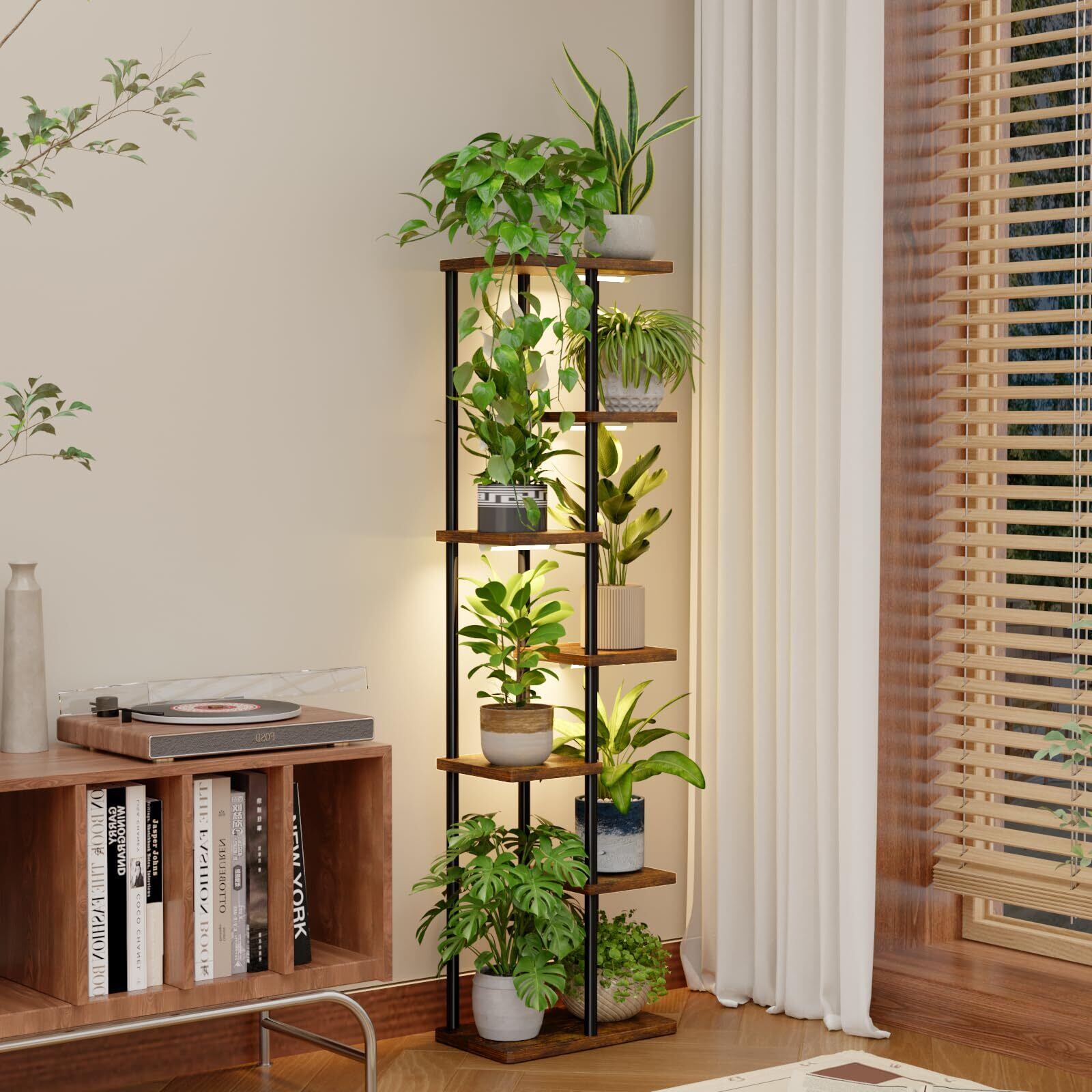 7段レイヤーで植物の層次感演出:多層式レイアウトで、下段から順番に花瓶・観葉植物・香り草・小物収納が可能!各段の高さ差を活かした配置で、天井光を効率的に受けられるため、植物の光合成が促進されます。縦長空間の家屋やコンパクトルームでも、視覚的に空きが広がるモダンな収納アイテムです