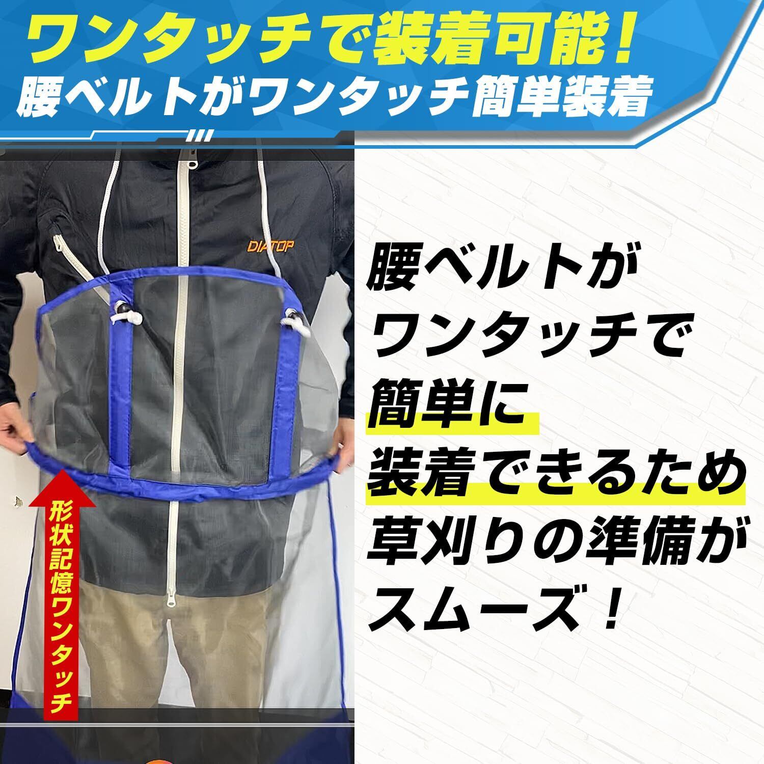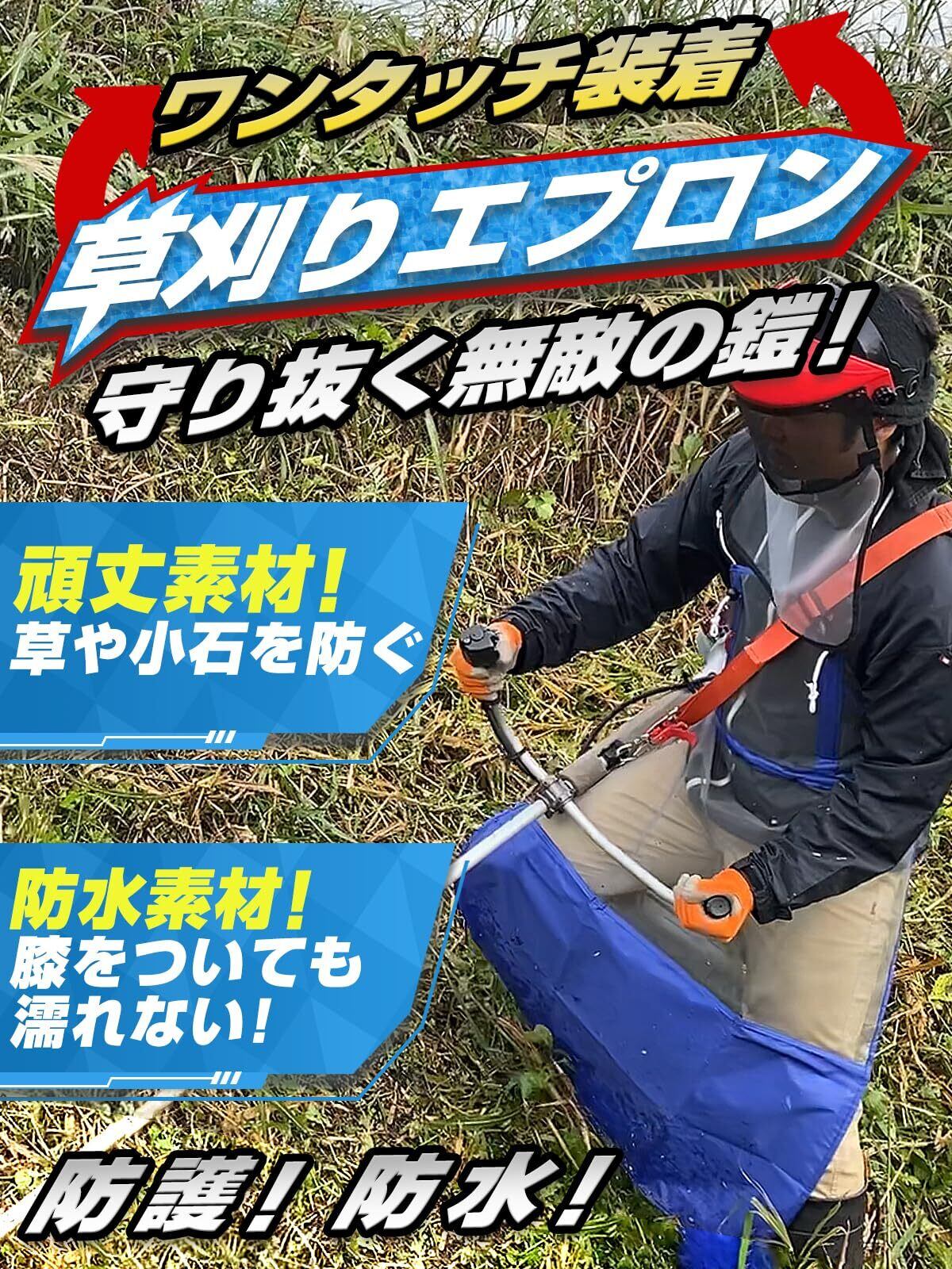 ワンタッチ装着可能な頑丈かつ防水素材の草刈り用エプロンです。 ①丈夫な素材で飛び散る草や小石から体を守る:メッシュ素材で通気性バツグンでありながら丈夫!飛び上が跳ねる草や、木、小石や泥などからしっかり身を守ります! ②ワンタッチで装着可能!腰ベルトがワンタッチ簡単装着:腰ベルトがワンタッチで簡単に装着できるため草刈りの準備がスムーズ! ③エプロン下部にシートがあるため湿った現場で膝を付いても汚れない:青い部分が防水素材となっているので膝をついたり湿った草が跳ねても濡れない! メッシュ素材で通気性バツグン!暑い日でも快適に作業可能! 調節可能な首掛け紐付き:ご自分の体のサイズに合わせてエプロンの高さを調節できるのでどなたでもご利用できる商品となっています。エプロンに飛散した草や土などは水で洗い流してください。※洗濯機では洗わないでください 【本体仕様】 ・草刈り時に使用するアクセサリー(防護防水エプロン)商品となります。 ・本体サイズ:高さ 約120cm(シート部40cm) ×幅 約75cm/本体重量300g 【その他】 ・エプロンに飛散した草や土などは水で洗い流してください。 ※洗濯機では洗わないでください