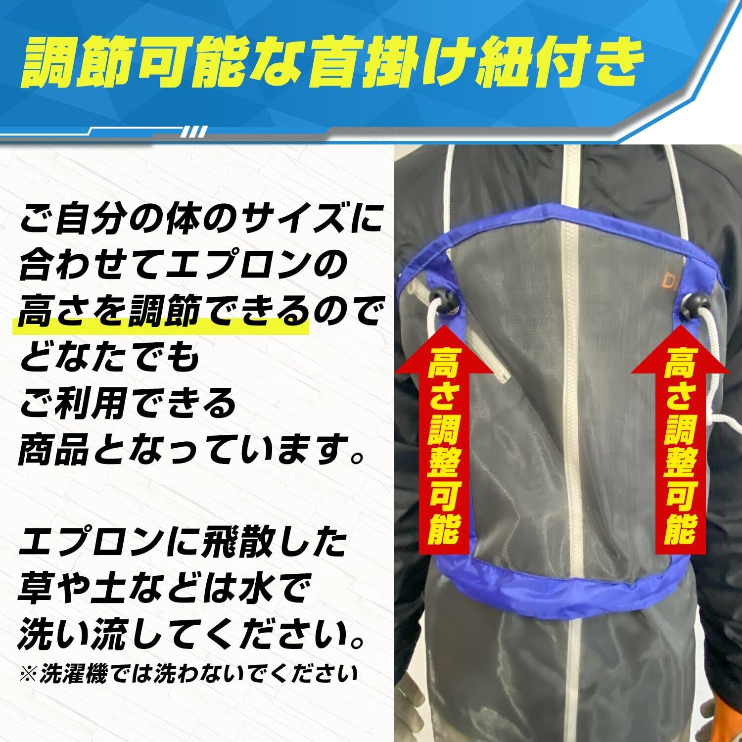 調節可能な首掛け紐付き:ご自分の体のサイズに合わせてエプロンの高さを調節できるのでどなたでもご利用できる商品となっています。エプロンに飛散した草や土などは水で洗い流してください。※洗濯機では洗わないでください