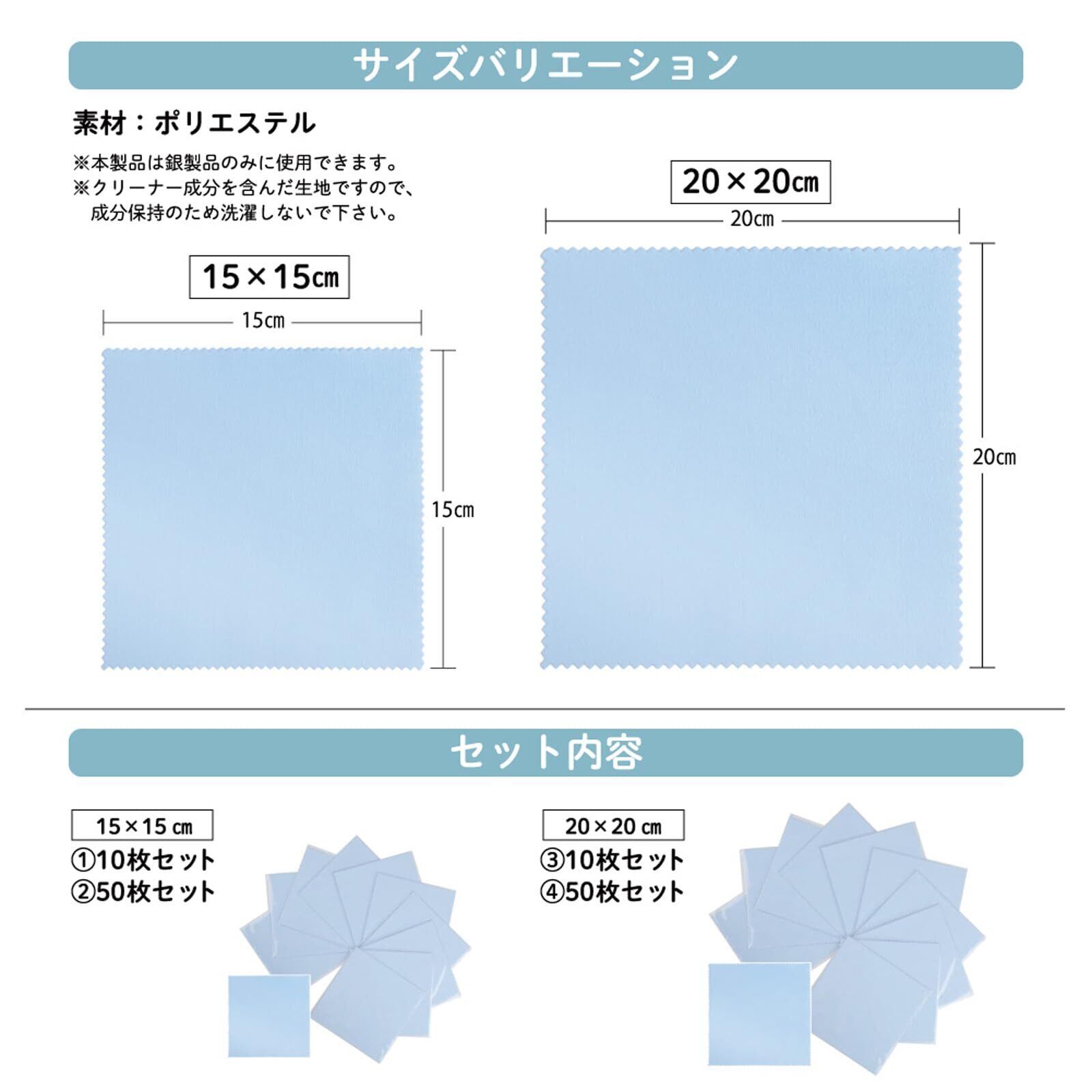 サイズ(約):20×20cm セット内容:10枚セット 素材:ポリエステル 生産国:中国 ※本製品は銀製品のみに使用できます。※クリーナー成分を含んだ生地ですので、成分保持のため洗濯しないで下さい。