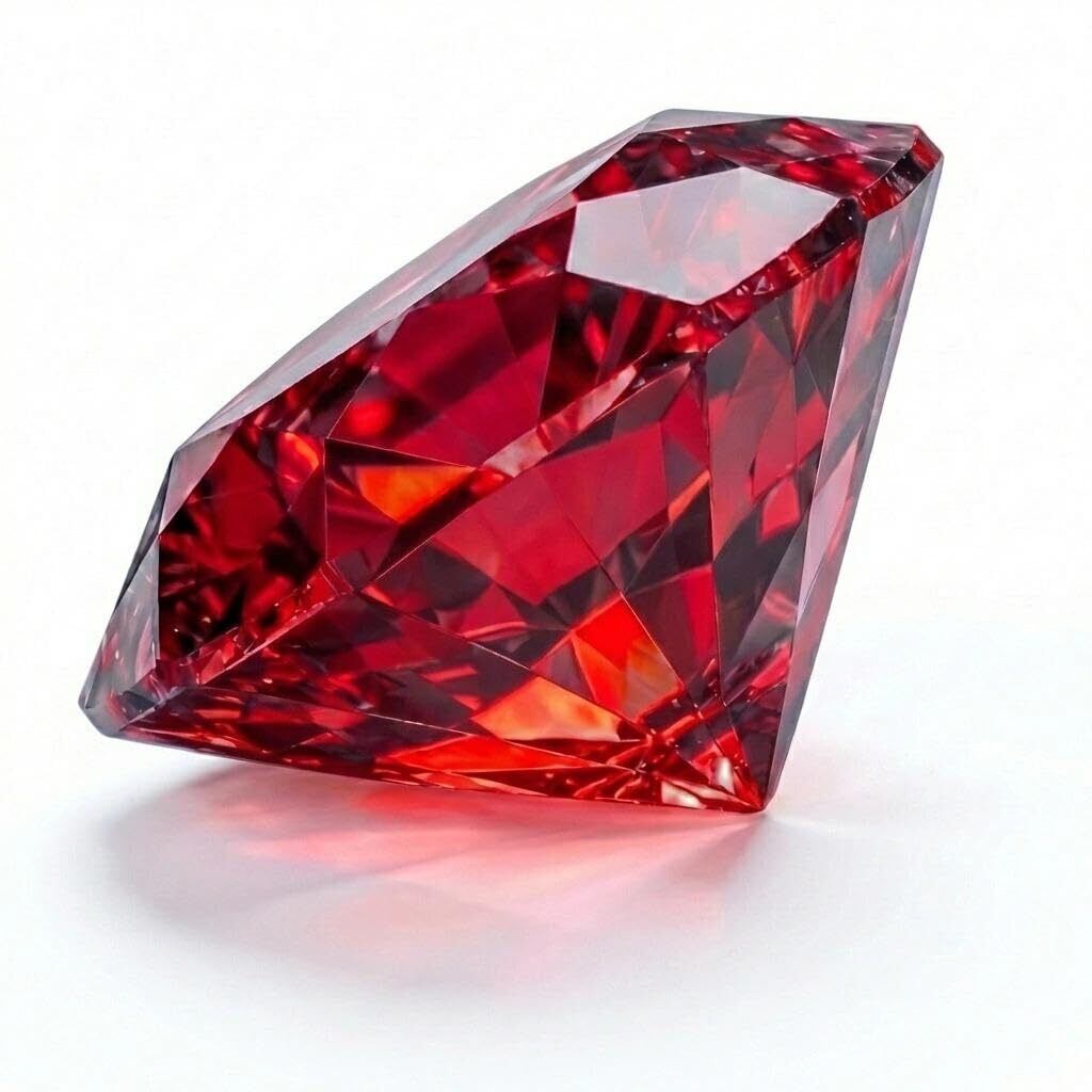 深紅/ルビーレッドの発色:人工ルビーのルースストーン(ラボ育成/ラボ)。深紅(しんく)/ルビーレッドの濃い赤色が魅力で、作品の主役ストーンとして存在感があります。