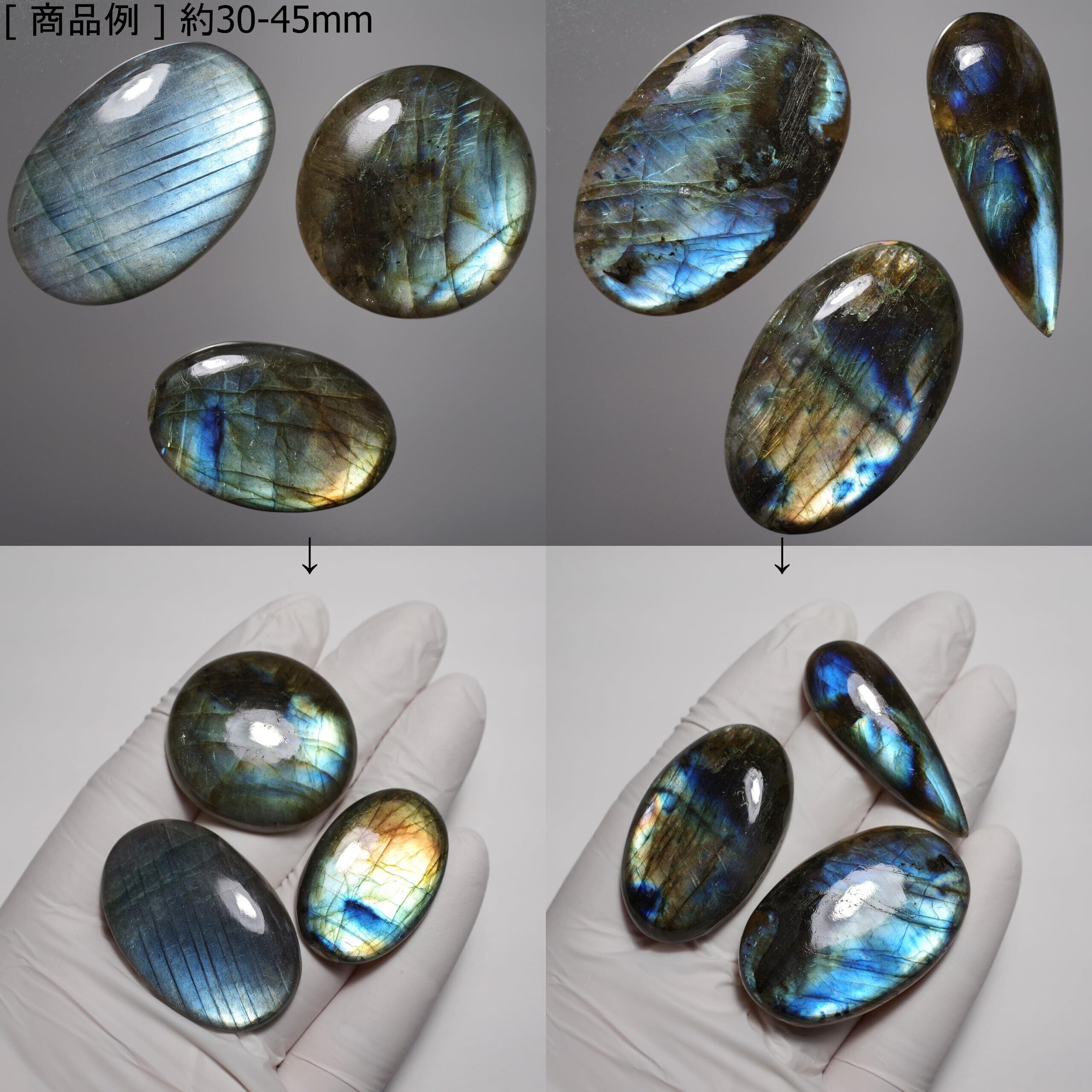 ラブラドライトは亀裂(ひびわれ)や内包物が多い鉱物ですので、カット・磨きを行うと顕在化します。その為、商品の特性上、ひびわれ・内包物・キズ・クラックがあります(画像参照)。 ※ランダム(無作為)で発送となりますので、色・形状などをお選びいただけません。 ※遊色が出る光の角度は異なります。また遊色具合には強弱があります。 ※手作業で行っておりますので形状に若干の歪さがあります。 ※ランダム抽出ですので、ご満足いただけない場合は「注文履歴」よりご指示頂ければご返金致します。