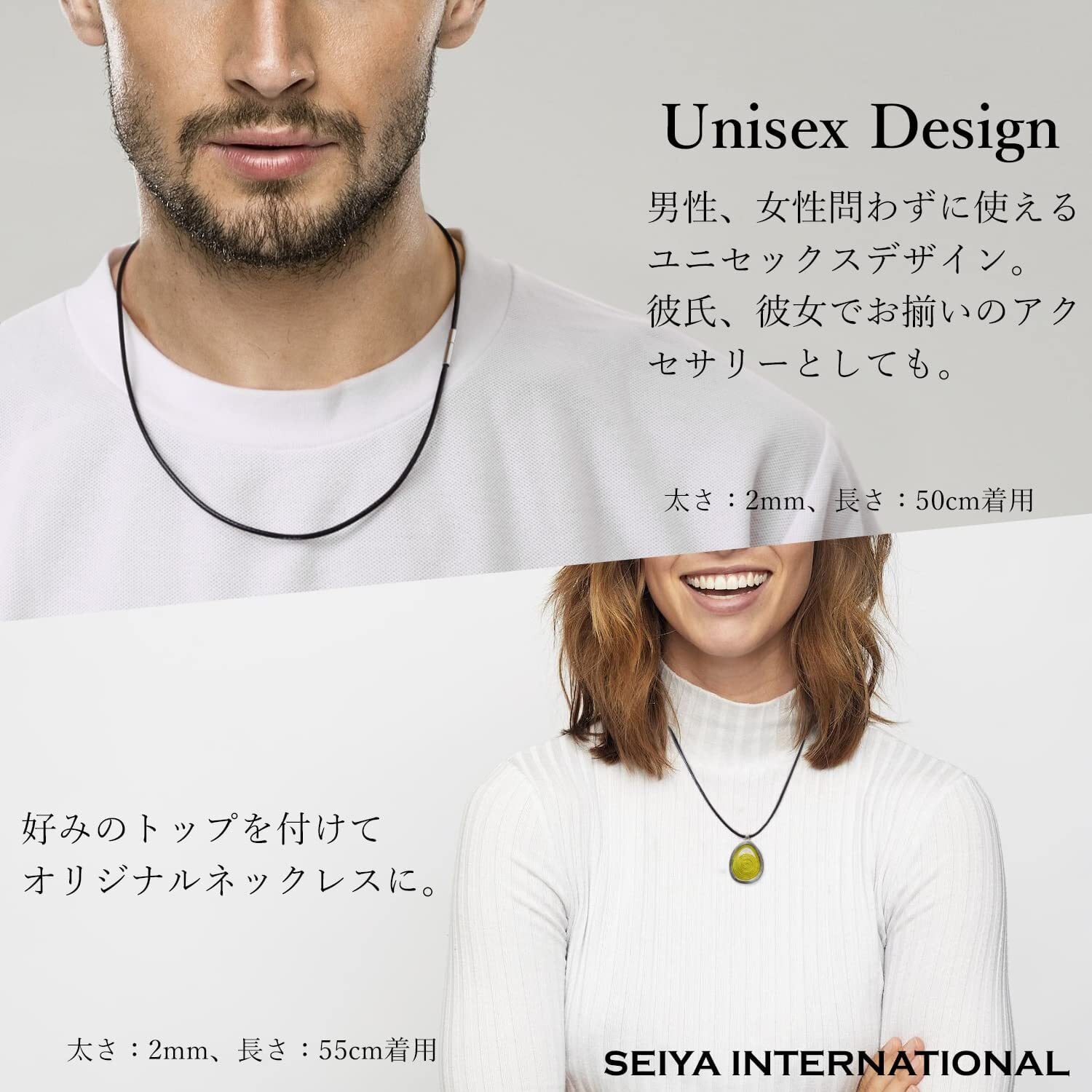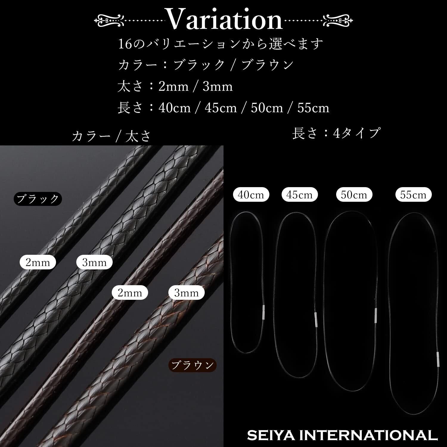 【選べるカラーサイズ】カラーは人気のブラックとブラウンをご用意しました。コードは細めの2mmと太めの3mmです。長さは40cm・45cm・50cm・55cmです。紐ネックレスはどんなファッションにも合わせやすく、太さや長さを変えるだけでも見栄えが違うのでコーディネートが楽しくなります。男性・女性問わずに使えるシンプルなデザインなのでプレゼントにも最適です。