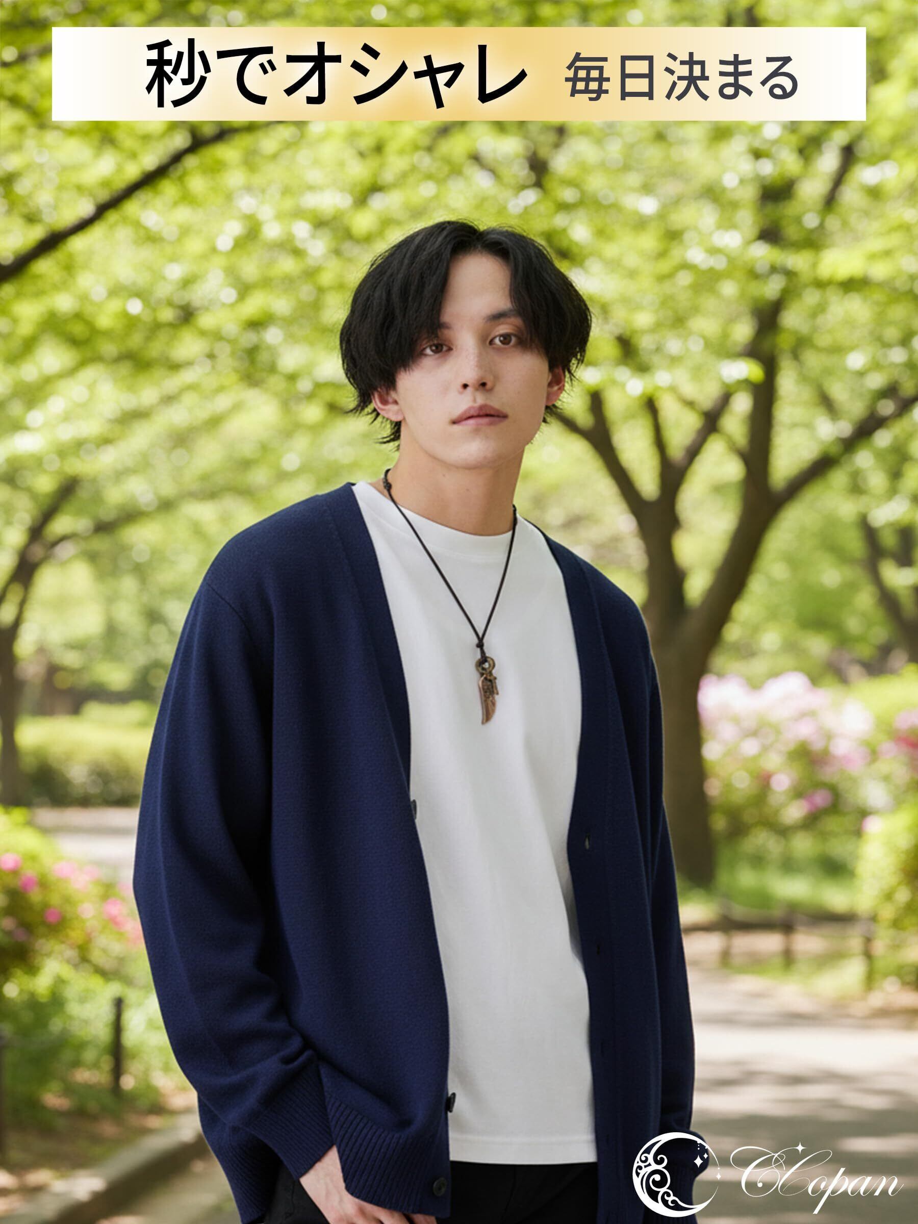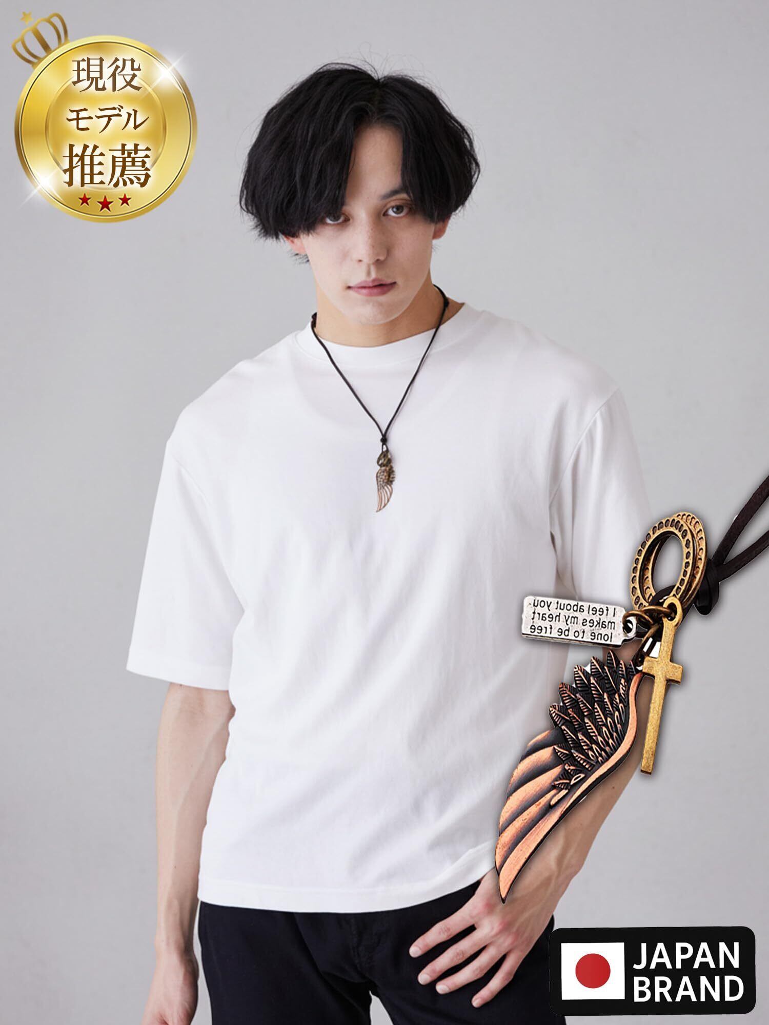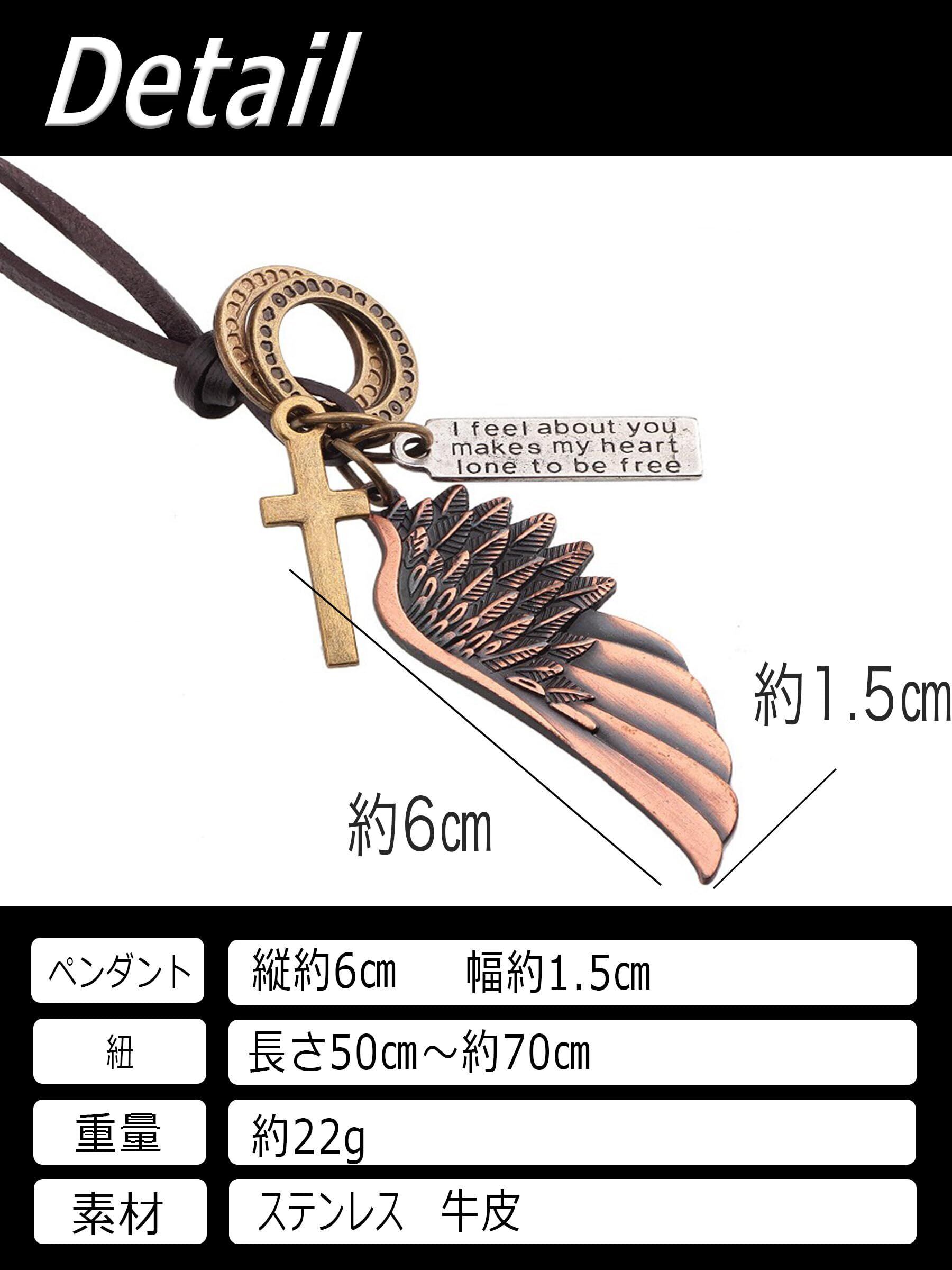 ウイング・クロス・プレートの3モチーフを組み合わせた、レザーコードタイプのメンズネックレス。牛革の紐はスライド式で長さ調整ができ、約50〜70cmの範囲で服の襟元に合わせてバランスを取りやすい仕様です。ペンダントは縦約6cm、幅約1.5cmの程よいサイズ感で、無地Tやニット、シャツなどシンプルな服でも胸元の印象をまとめやすいデザイン。トップはステンレス素材を採用し、立体的なディテールが見えやすいのもポイントです。重さは約22g。普段使いはもちろん、誕生日や記念日などのプレゼントにも合わせやすく、コーデの雰囲気を変えたいときに取り入れやすい一本です。