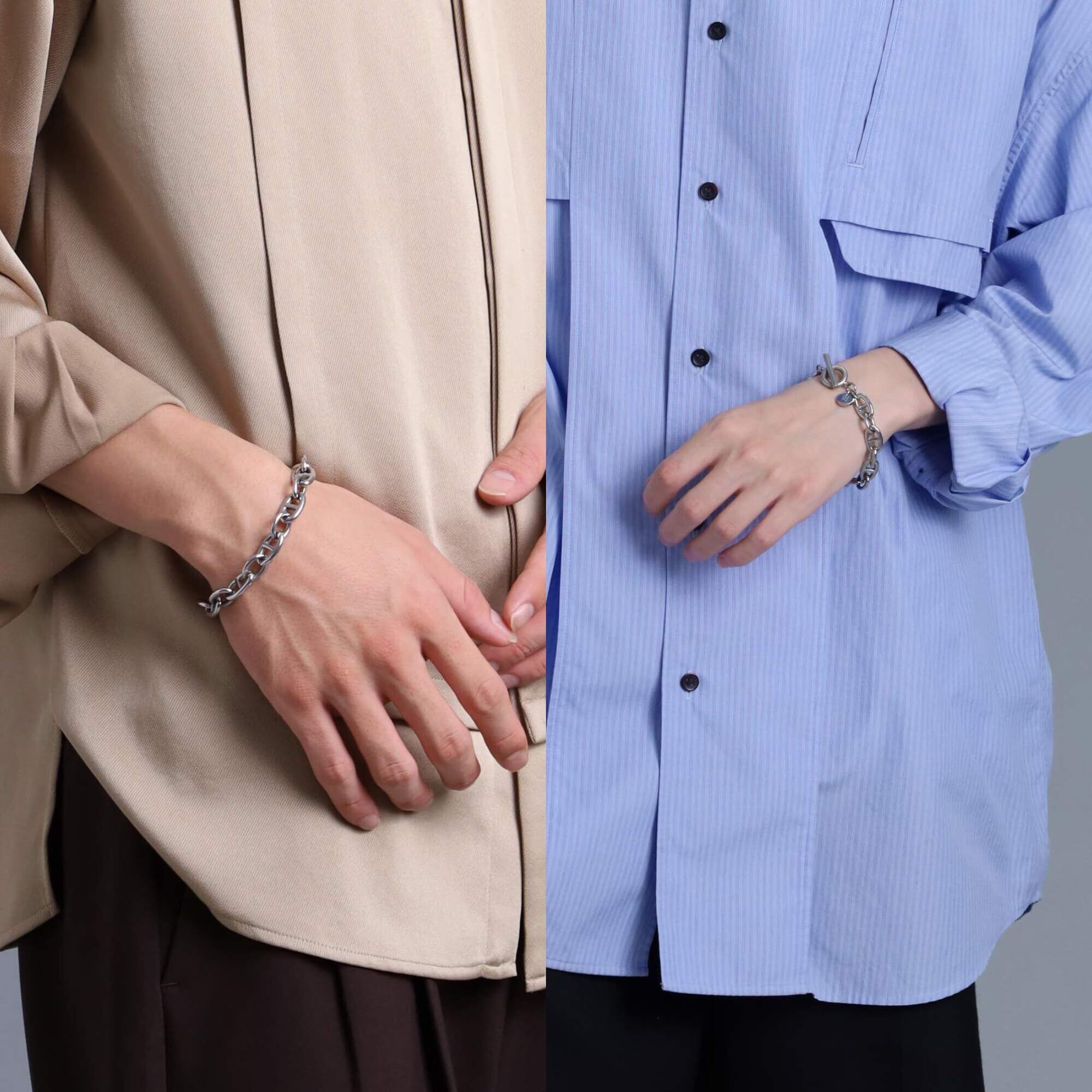 【付けやすく外れにくいTバー仕様】メンズブレスレットの中でも人気の高いTバー&マンテル機構を採用したチェーンブレスレットです。バーを輪に通すだけのシンプルな構造で、忙しい朝でも素早く着用でき、日常使いにおいても外れにくい安心設計。マット仕上げのステンレス素材は使い込むほどに光沢が増し上品な質感を楽しめます。手元にアクセントを添える太めのチェーンは、さまざまなコーディネートに馴染みます。