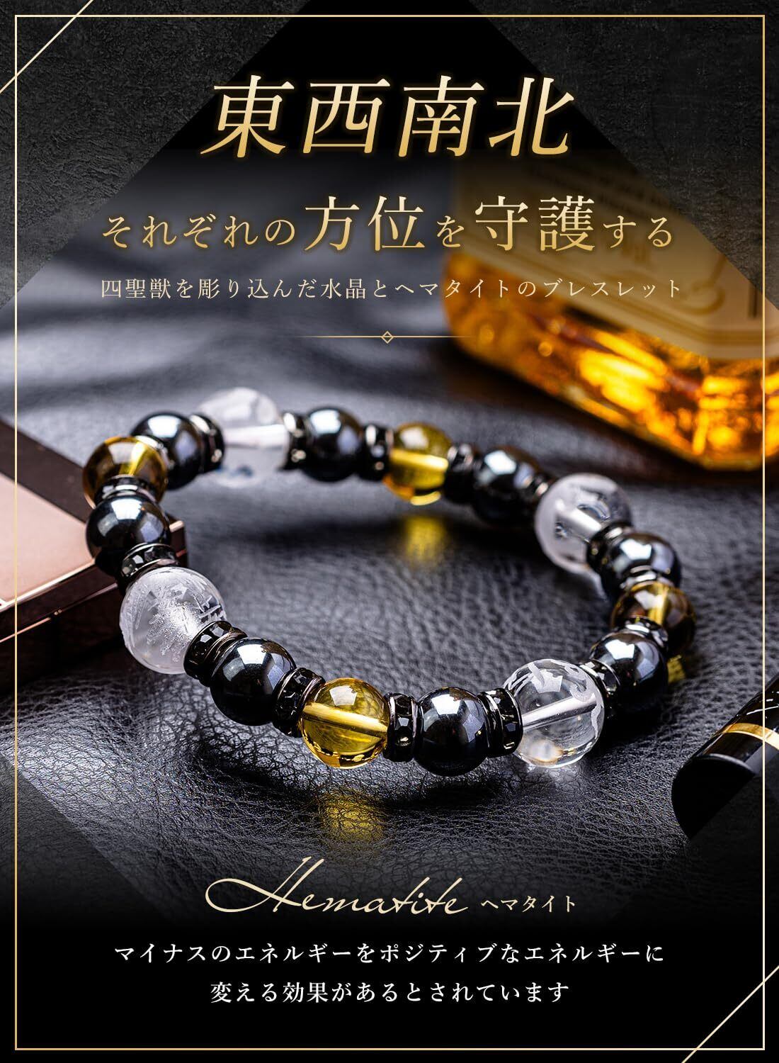 四方を護る、至高の守護石。 四神獣を彫り込んだメンズブレスレット 四神獣(しじんじゅう)は、中国の神話や風水に由来する東西南北の方角を守護する四体の聖獣です。 古代中国の陰陽五行思想と結びつき、日本でも風水やスピリチュアルなシンボルとして広く知られています。