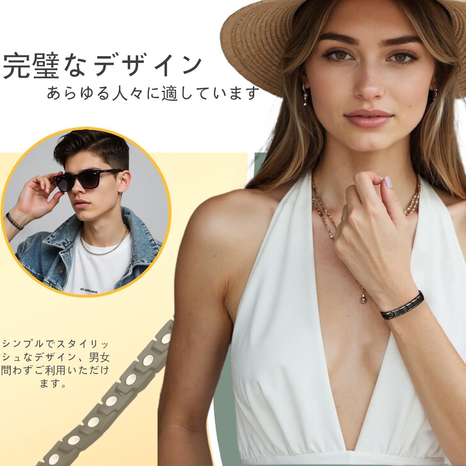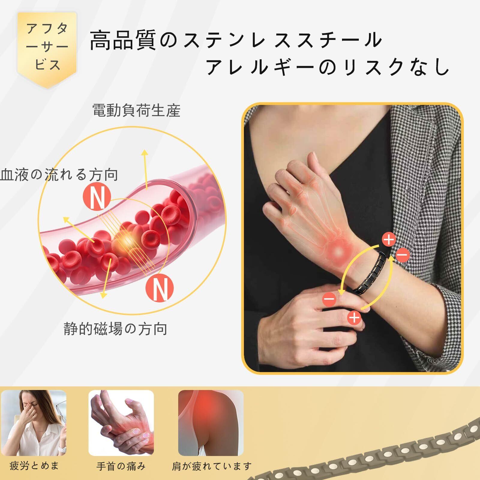 【健康効果】: この磁気ブレスレットは静電気を除去する機能に加え、特殊な磁気設計を採用しています。 磁場は人間の健康に良い影響を与え、このブレスレットを身に着けることでより良い健康を維持することができます。