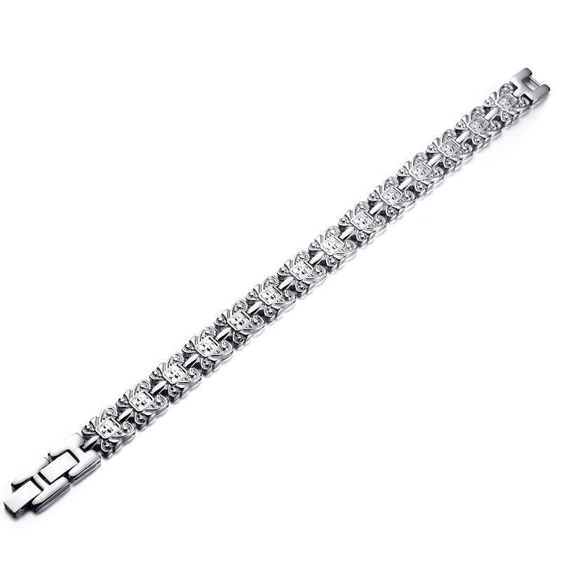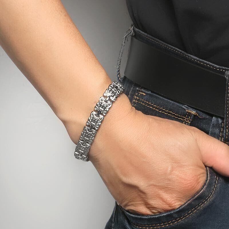 【Rockyu ブレスレット】鉄鋼製の高耐久性ブレスレット。しっかりとした作りとスタイリッシュなデザインが魅力です。長さ:22.5cm、幅:8mm、重量:63.5g。高品質な素材で、長期間使用可能です。