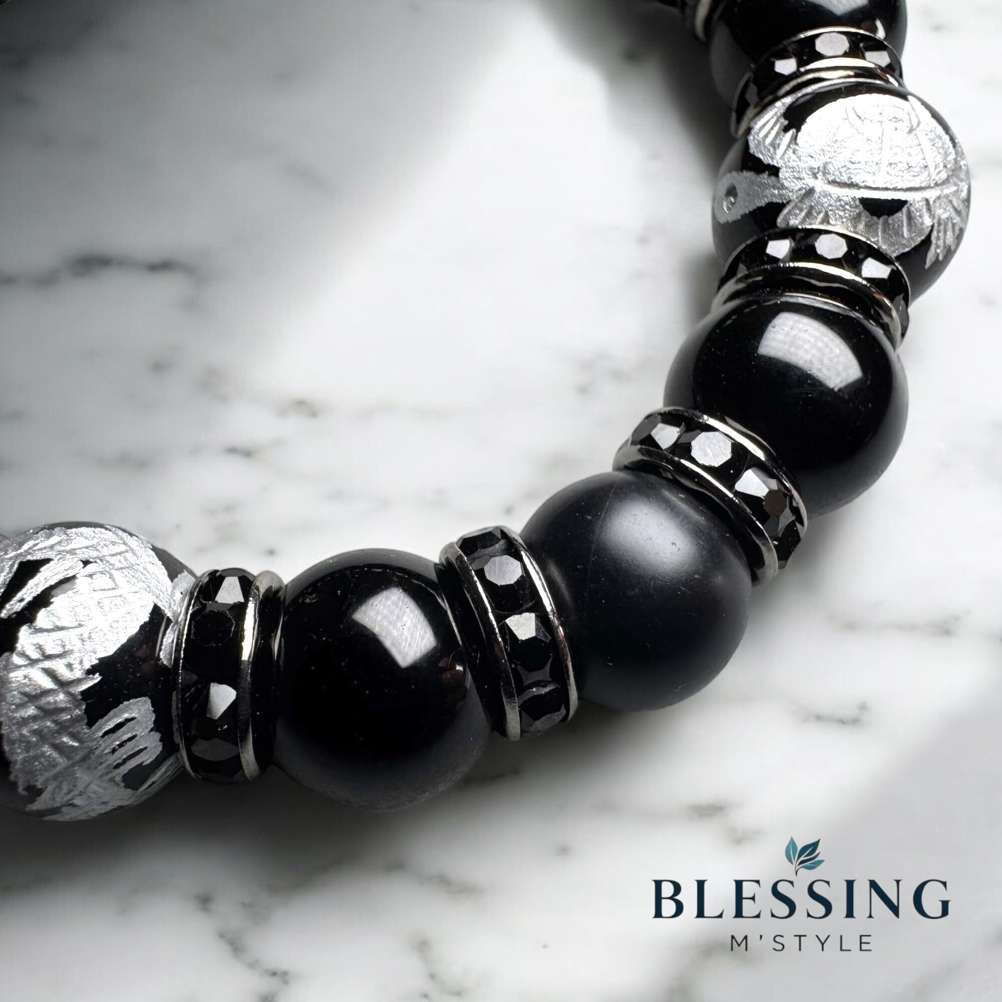 【サイズ】 内周約18cm オニキス銀彫四神獣14mm モリオン(黒水晶)12mm マットオニキス12mm