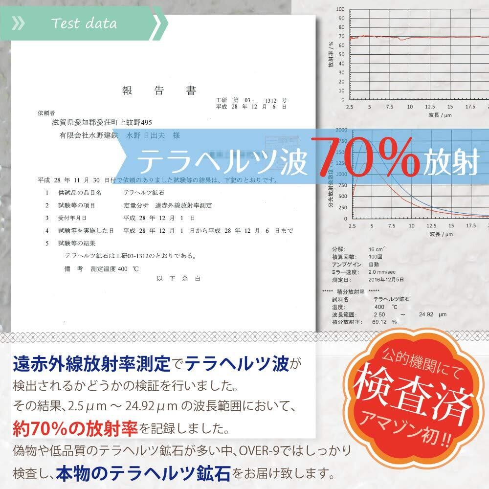 【公的機関にて検査済み】偽物や低品質の安価なテラヘルツ鉱石も出回っておりますが、OVER-9では公的機関にて何度も検査し、テラヘルツ鉱石の純度約99%、テラヘルツ波の放射率70%を確認しております。皆様に安心して本物のテラヘルツ鉱石を体感して頂ければと思っております。
