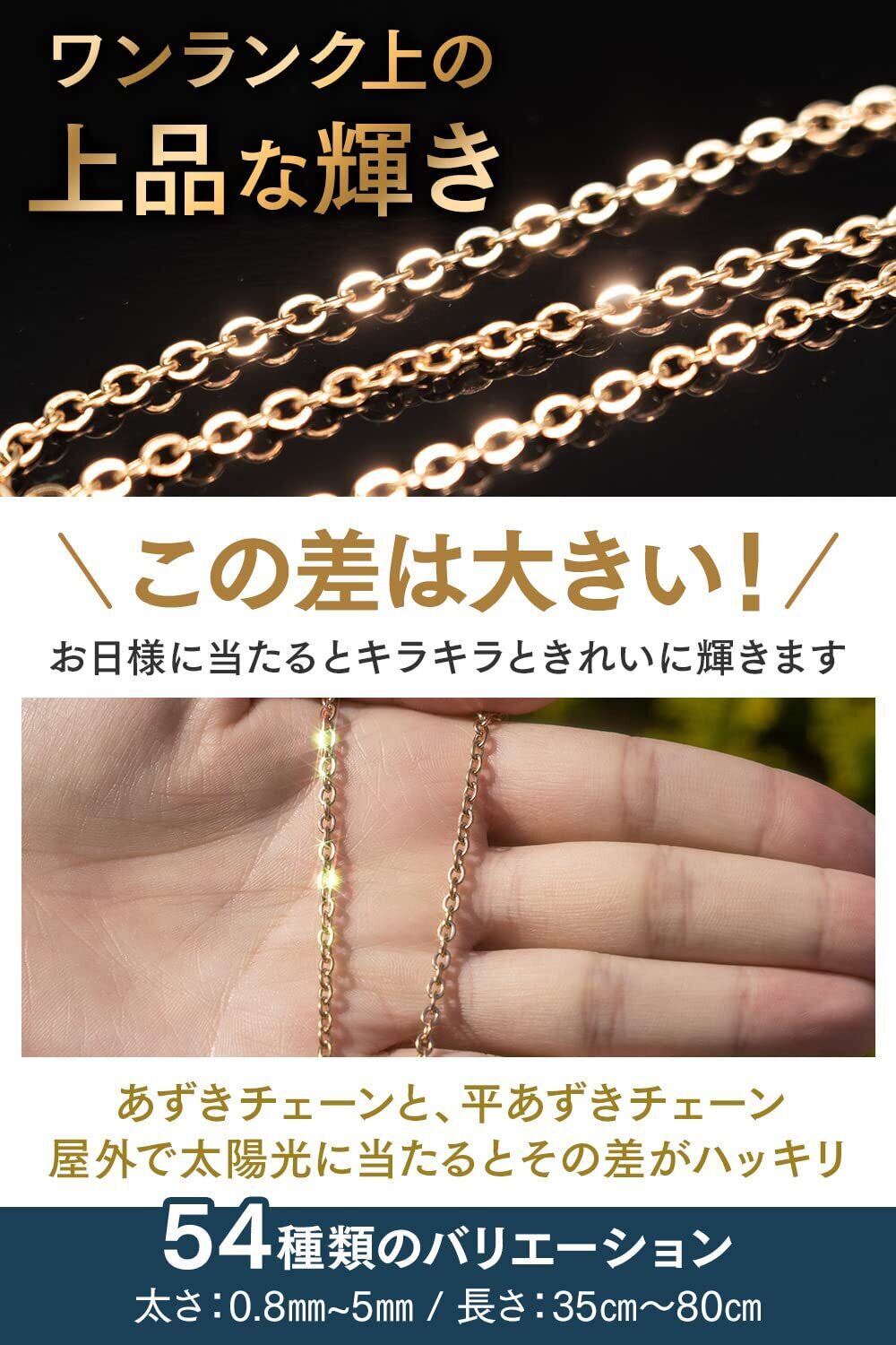 【キラキラ輝くピンクゴールド平あずきチェーン】高品質IPコーティング(イオンプレーティング)で色落ちせずいつまでも輝きがあせません。向きが交互に異なる構造により平面が光を受けてキラキラと輝くのが特徴です。リング同士の隙間がほど良い抜け感を演出し派手過ぎない上品さを醸しだしてくれます。シンプルにチェーンだけでもおしゃれ度を上げてくれます。
