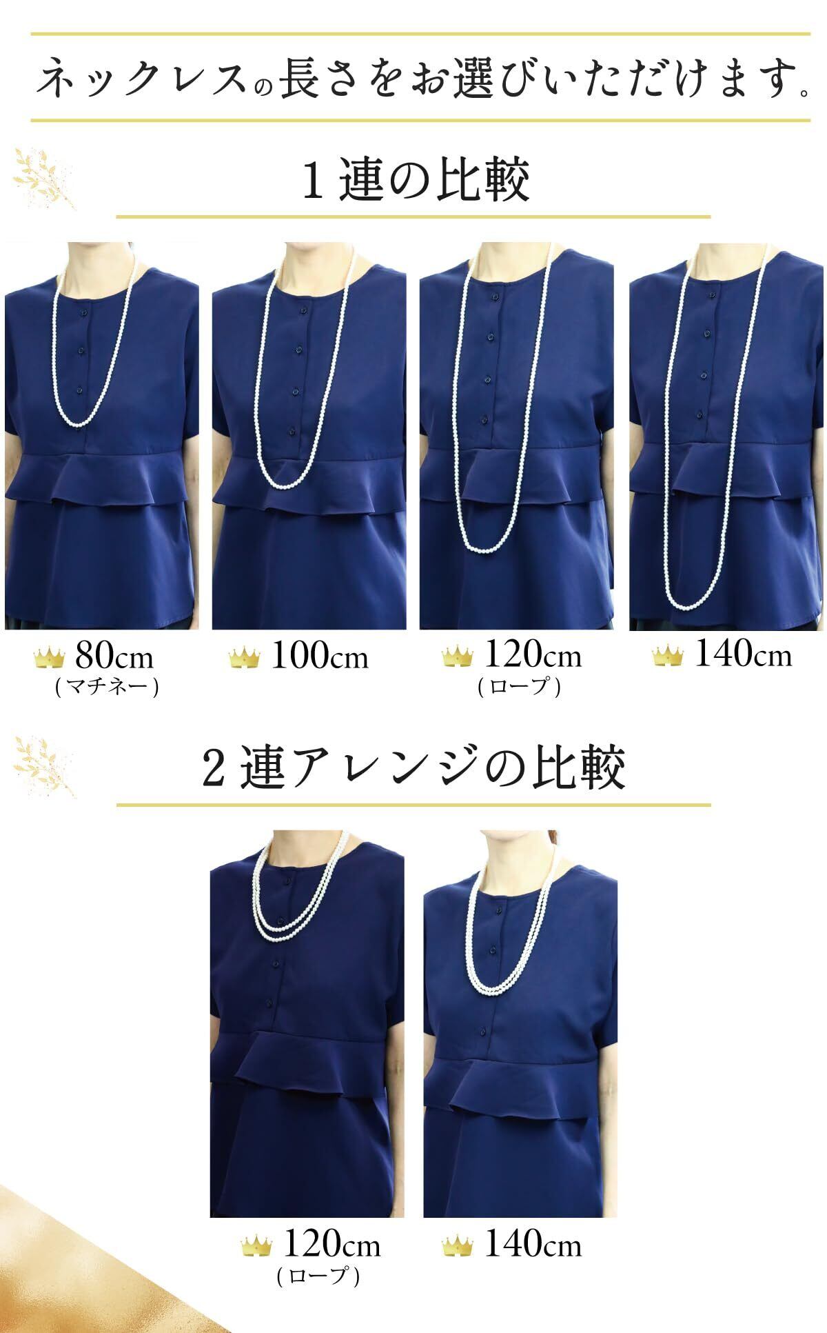 【さまざまなシーンで活躍!】 ハレの日の結婚式や入学式などのおめでたいフォーマルシーン 、パーティーやイベントなどの華やかな装いの場に、オフィスや普段使いのカジュアルシーンまでさまざまな場でお使いいただけるロングパールネックレスです。【軽くて使いやすいパール珠を採用】ロングパールなのに重くなり過ぎない6mm珠を採用!シングルの80cm~100cm や2連&結びアレンジOKの120cm~140cmまで4種類のサイズをご用意しました。