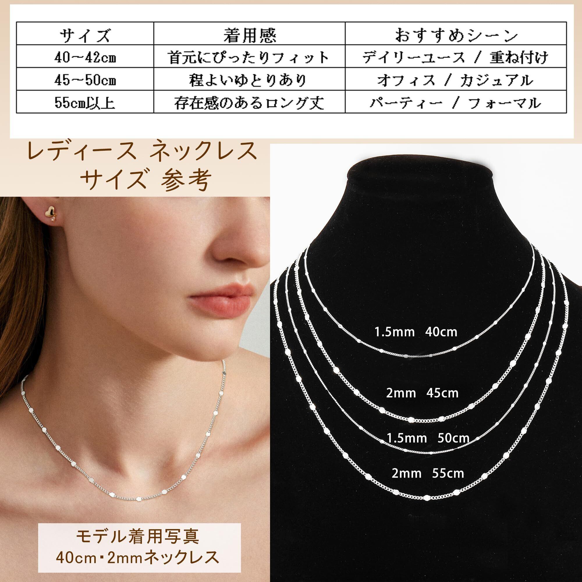 【豊富なサイズ】シルバーネックレスは、ご自身にぴったり、重ね付けもお楽しみいただけます。幅:1.5mmと2mmの2種類、41/46/51/56/61㎝+5cm延長チェーン。お客様の首元にきれいにフィットいたします。単品でのシンプルなご使用はもちろん、他のネックレスとお重ねになって、トレンドのレイヤードスタイルをお洒落にお楽しみいただけます。