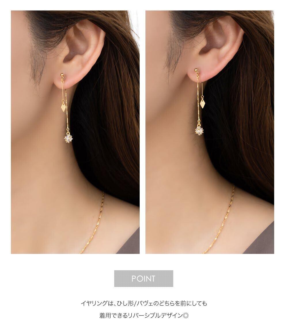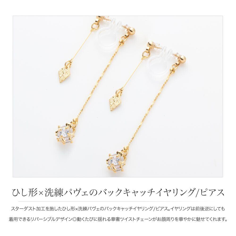 スターダスト加工を施したひし形×洗練パヴェのバックキャッチイヤリング/ピアス。イヤリングは前後逆にしても着用できるリバーシブルデザイン◎動くたびに揺れる華奢ツイストチェーンがお顔周りを華やかに魅せてくれます。
