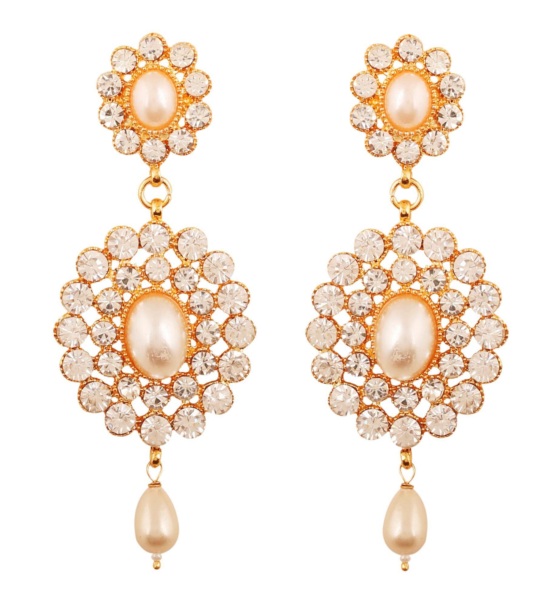 合金メタル、リッチで伝統的なインドのロングデザイナー、ゴールドトーンのフェイクパールとホワイトクリスタルを使用した無限のイヤリング。