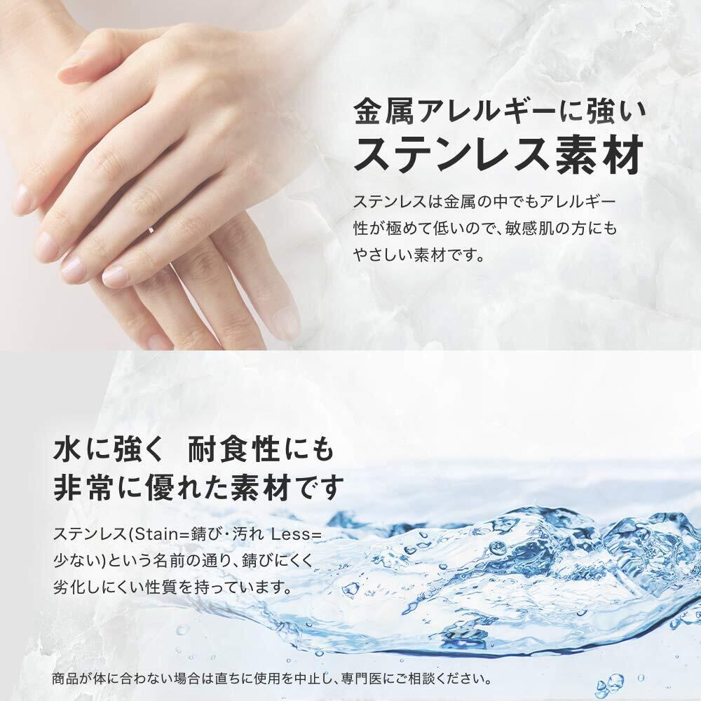 【金属アレルギー対応】ステンレスは金属の中でもアレルギー性が極めて低い素材です。 【お風呂、海OK】耐食性がとても高いので水や汗によるサビ、変色に強いのでお風呂や海へ気にせずアクセサリーを着けたまま入ることができます。 【お手入れ簡単】ステンレスは硬い金属なので傷がつきにくく、変形しにくです。また水にぬれた時も乾いたタオルでさっと拭くだけでOK