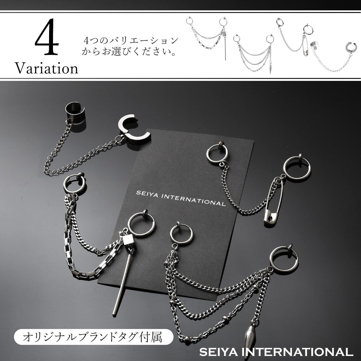 【 人気のデザイン 】片耳用たれさがりイヤーカフチェーン。耳たぶ(イヤーロブ)と軟骨部分(ヘリックス)への装着で取付け可能のチェーンがたれ下がるイヤーカフ、フェイクピアスです。定番のフープタイプにチェーンや各チャーム(スティックやスパイクや安全ピン)が付いた揺れるフェイクピアス。韓国 K-POPアーティスト、韓国アイドル、日本のダンサー、HIPHOP、B系など多数着用している人気のデザインです。韓国ファッション、オルチャンファッション好きな方や通常のフープイヤリングに飽きてしまった方にとてもオススメなアクセサリーです。ピアス穴不要なので簡単に着用でき、男性、女性、お友達や同僚、恋人へのクリスマス、バレンタインデー、誕生日などの記念日のプレゼントとしてもオススメです。