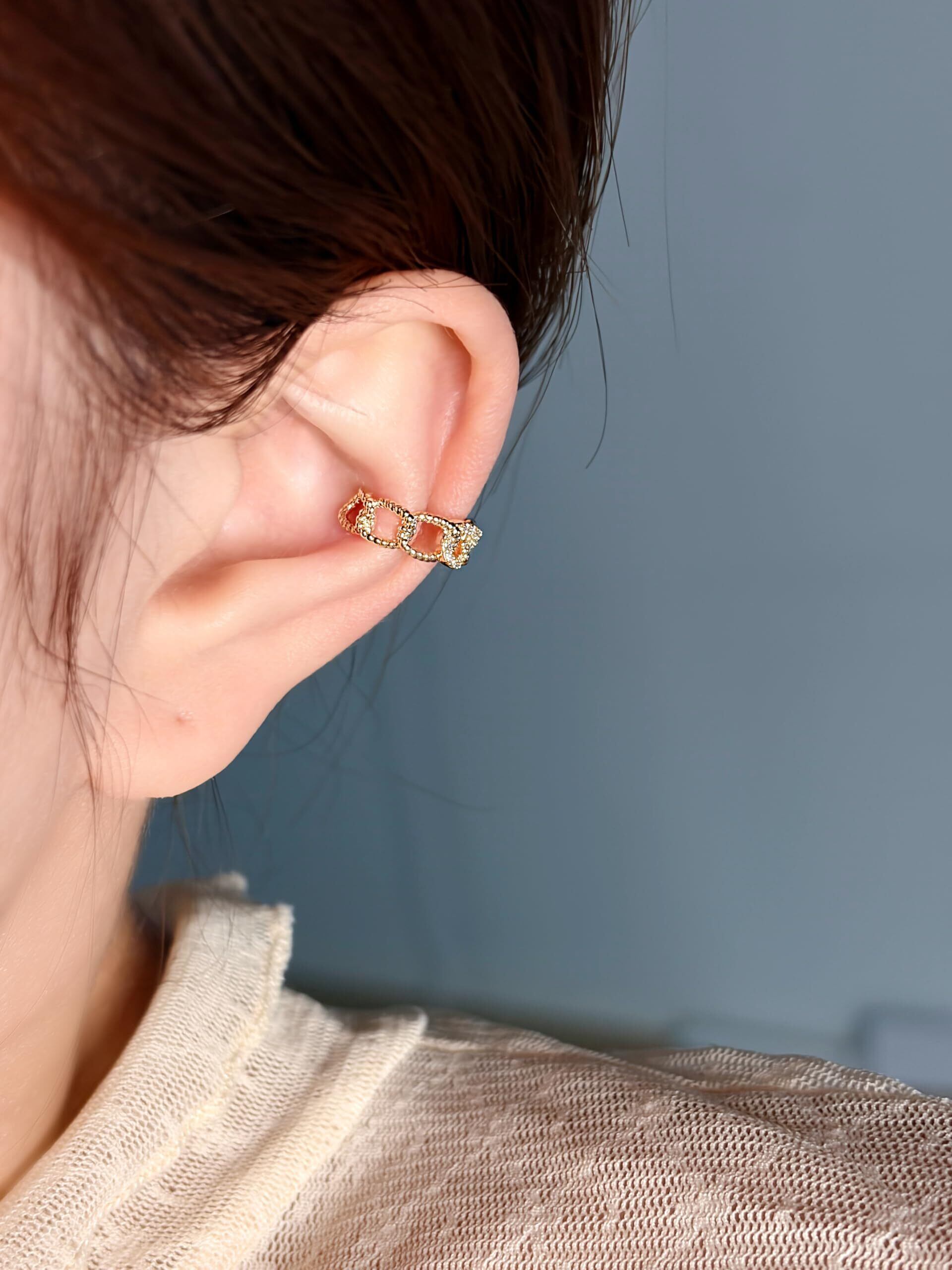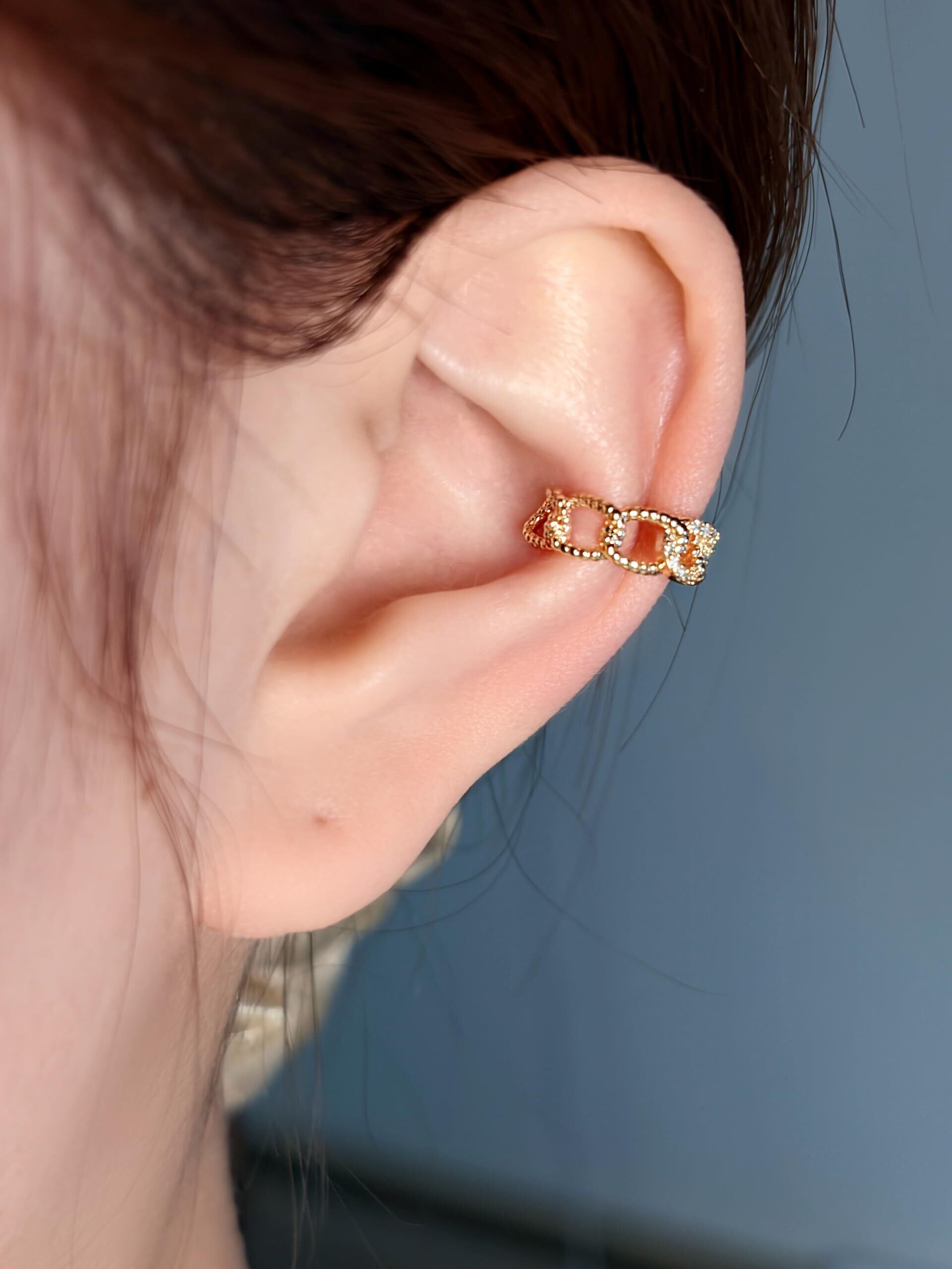 【チェーン風 ジルコニア イヤーカフ】小ぶりながらも耳元をしっかりと彩るアクセントに最適な仕上がり。その日の気分や、ファッションによって付ける位置を変えられる普段使いにおすすめ。