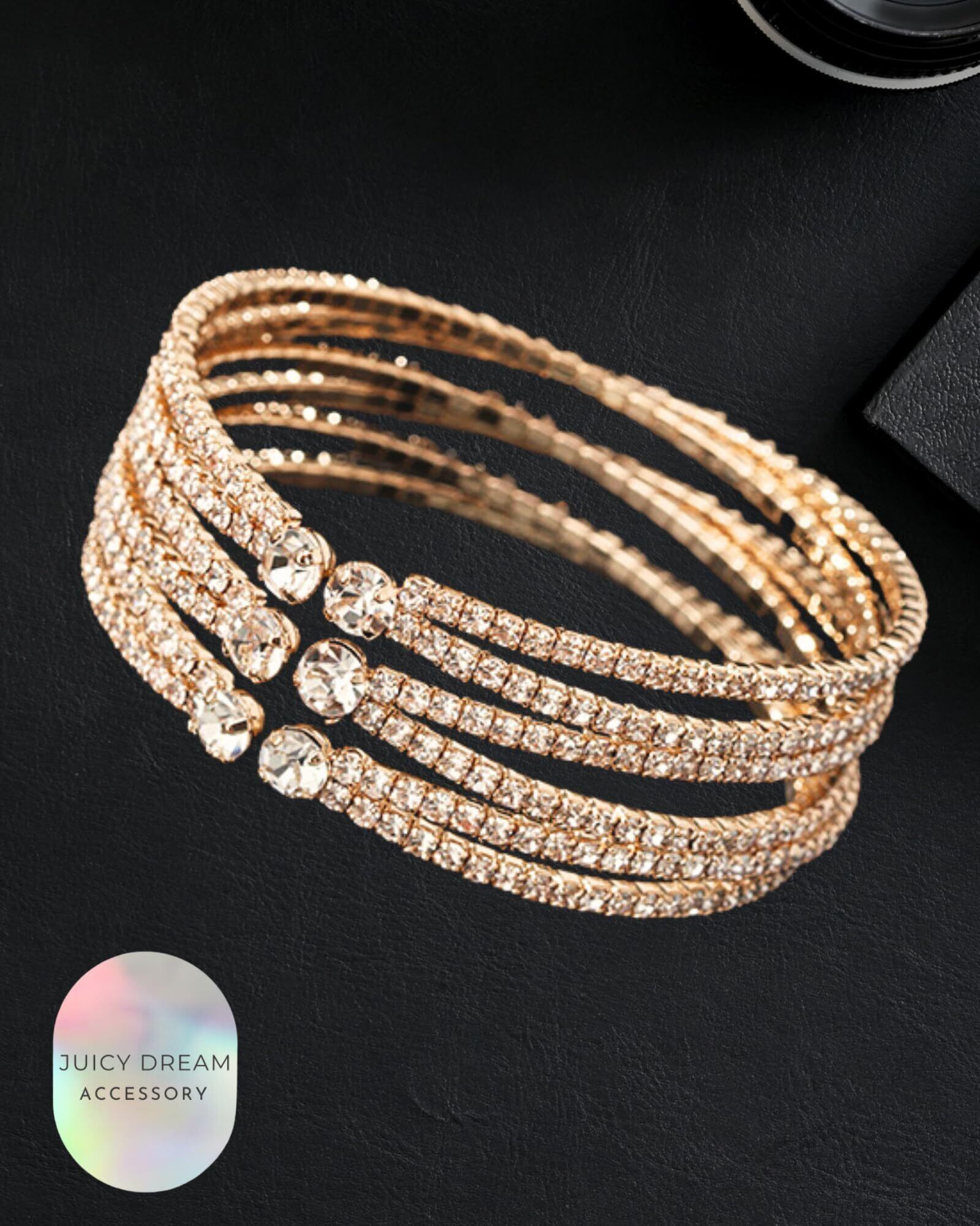 6連に連なり付けるだけで手首を華やかに彩るデザイン。コンテストや舞台、パーティーなどの特別なシーンで幅広いシーンでお使いいただけます。C型バングルで簡単に着脱ができストレスフリーな万能アイテム。高品質の合金とクリスタルストーンを使用しており、エレガントなアクセントをプラスします。