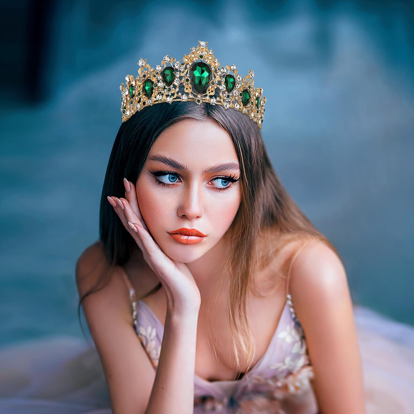 優雅なブライダルクラウンデザイン:LurroseのBride Crownはバロック様式の花嫁の王冠で、グリーンとゴールドの配色が結婚式や特別なパーティーに華やかなアクセントを加えます。