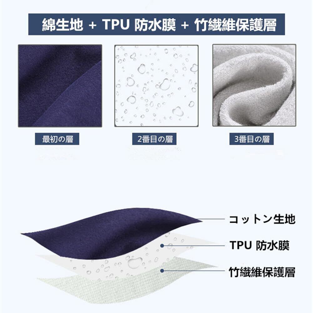 【上質材質】外側に肌さわりのいい綿100%、中層にTPU防水フィルムが内蔵、直接肌に触るの側には柔らかくもふもふ触感の生地を採用します。安心しておやすみいただけます。