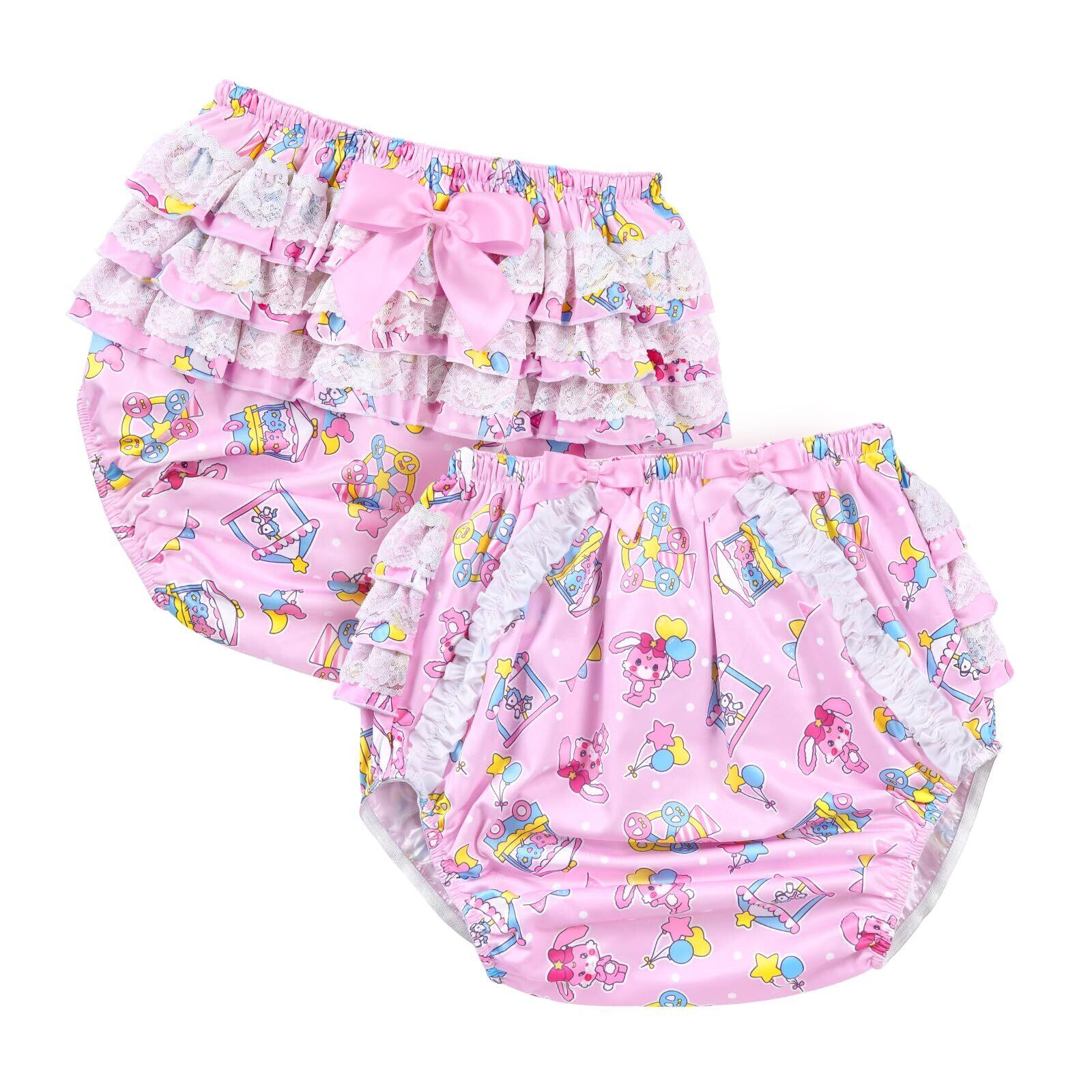 大人用シルキーおむつカバー 総柄 バックに3層重ねレースフリル 大きなリボン飾り ストレッチウェストで快適 防水・漏れ防止 洗濯可 ピンク S