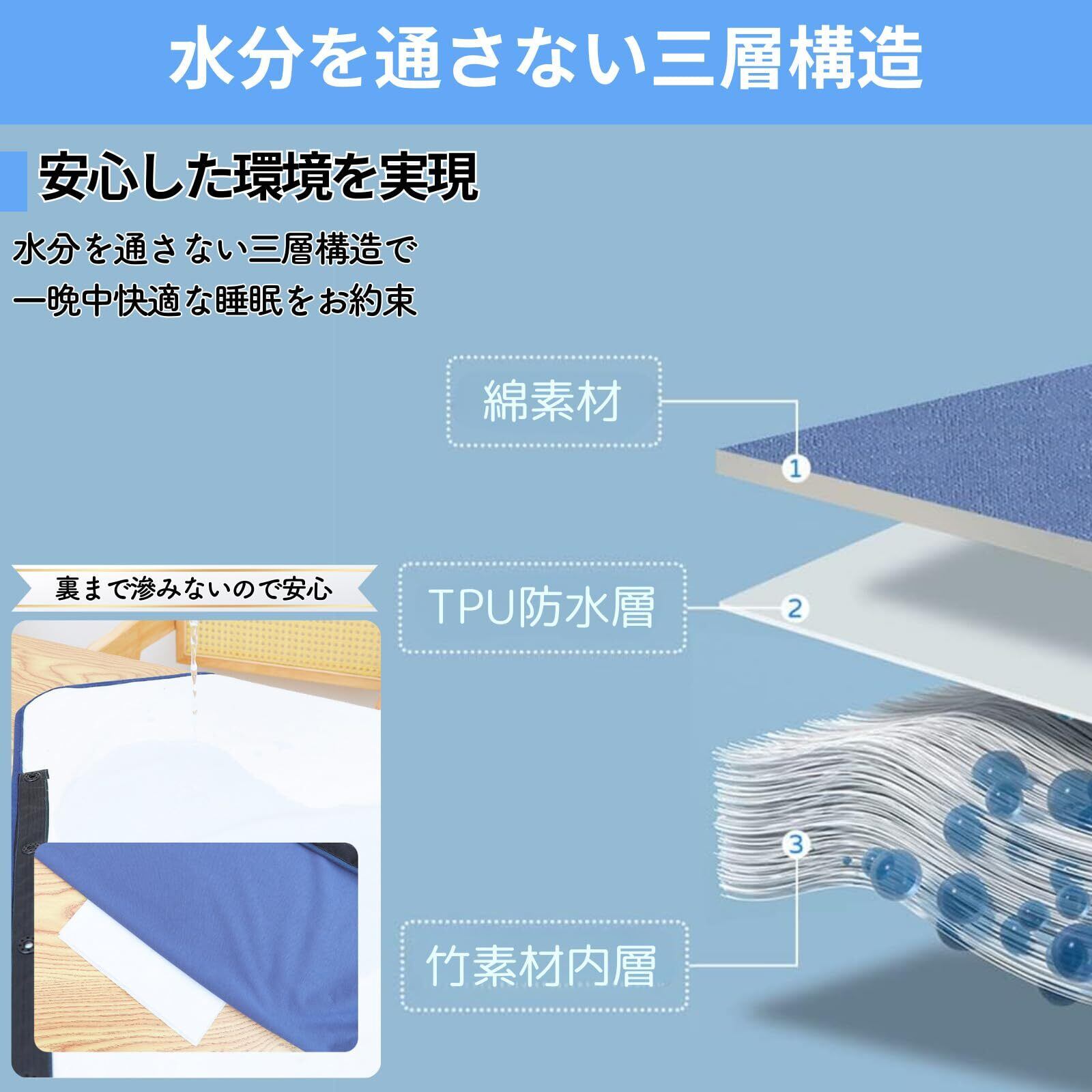 大人用おむつパンツは、3層式、ウエストゴム、隠しファスナーで使用者の失禁の心理的負担を軽減。表面は肌触りのよい100%コットン、裏面は防水性に優れたTPU、ポリエステル。洗濯機で丸洗いOK、お手入れしやすい。TPU防水層によって電気毛布の上でも使用可能です(商品の給水量によっては布団に付着する恐れがありますので、電気毛布に限らず漏れには十分ご注意をお願いいたします)