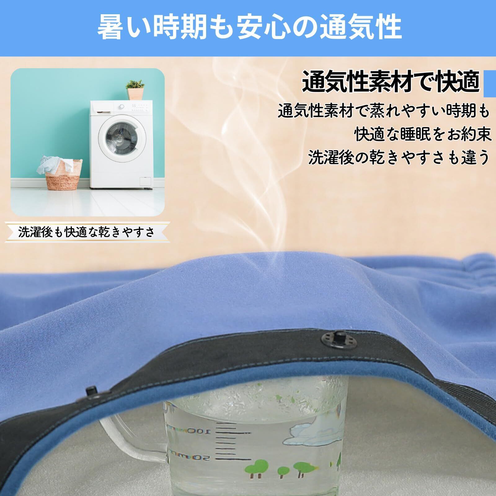 防水カバーはフルオープンにできるファスナー式で着脱簡単。シーツの上に引く、スウェット、パジャマ、ズボンの上から巻きスカートに、掛け布団、用途ごとにアレンジ可能。フルジッパーでマジックテープ、ボタン式に比べ外れにくい。