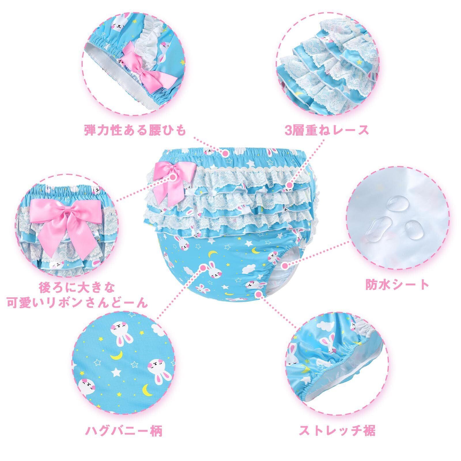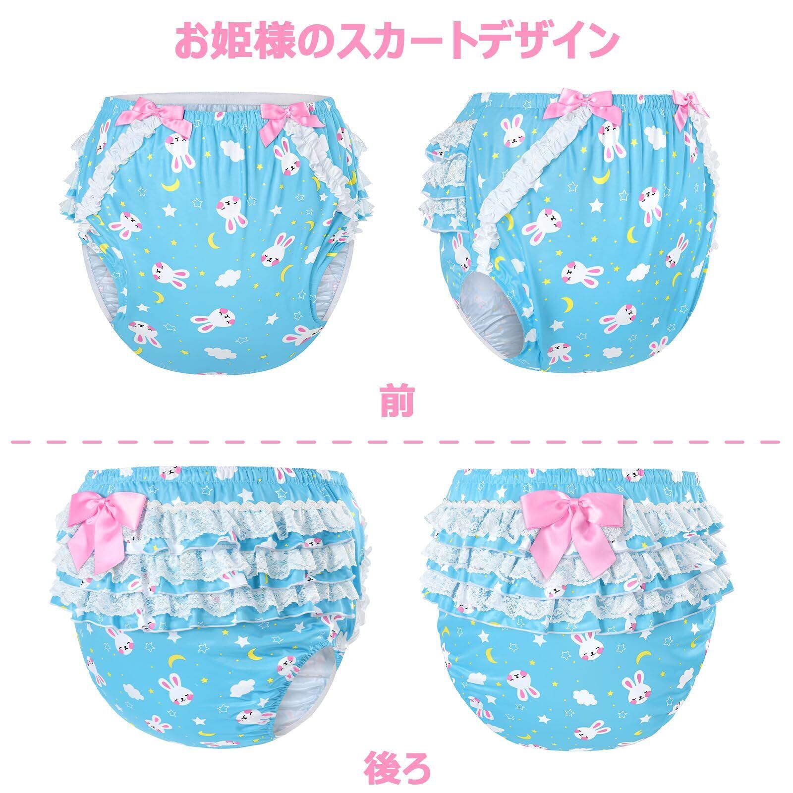 大人用シルキーおむつカバー 総柄 バックに3層重ねレースフリル 大きなリボン飾り ストレッチウェストで快適 防水・漏れ防止 洗濯可 ブルー L