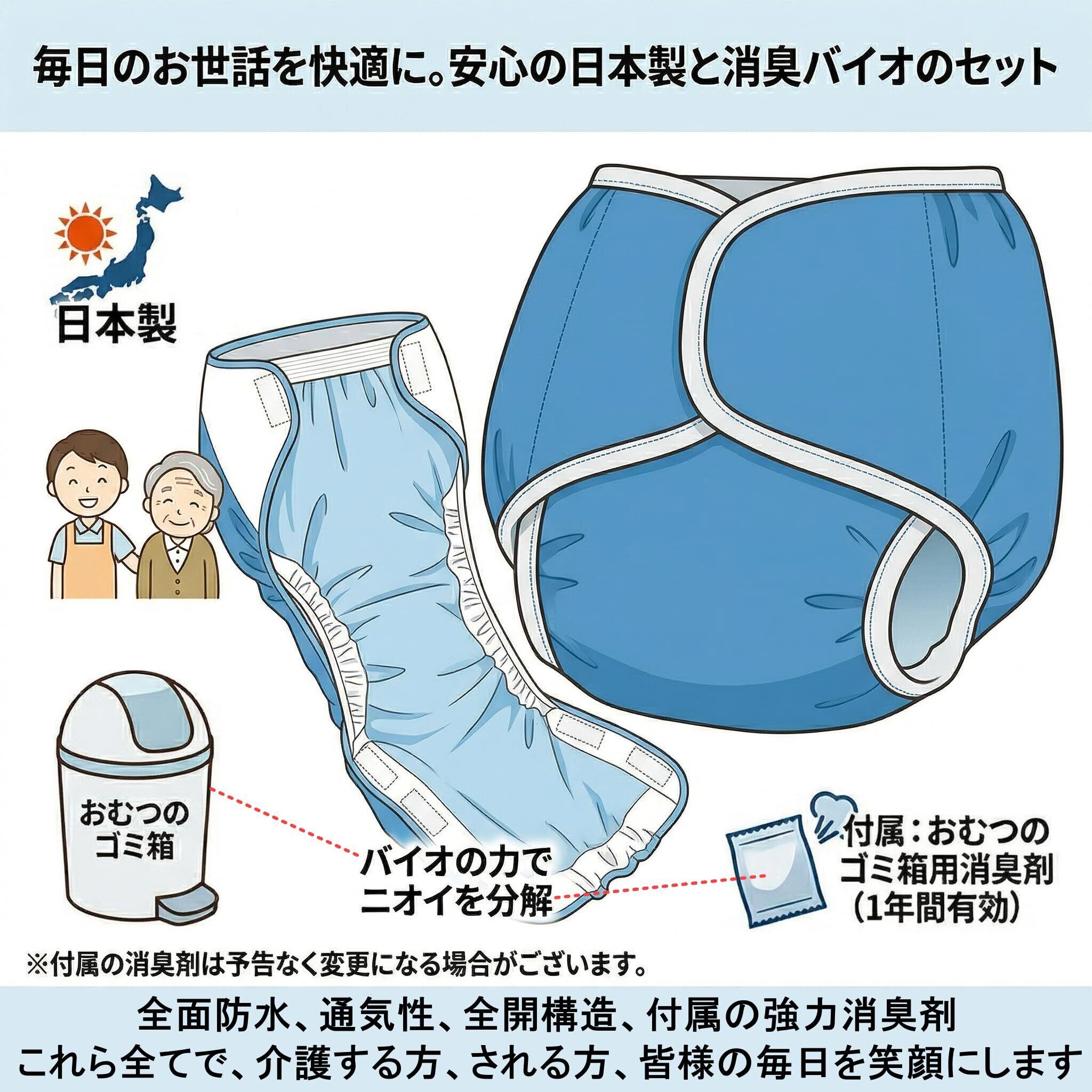 [付属] おむつのゴミ箱用消臭剤(1年間有効)をもれなく同梱しております。trustmapでは、介護パジャマ・寝間着・失禁ショーツなど、介護ケア衣料を各種お取り扱いしております。ぜひtrustmapで検索してみてください。