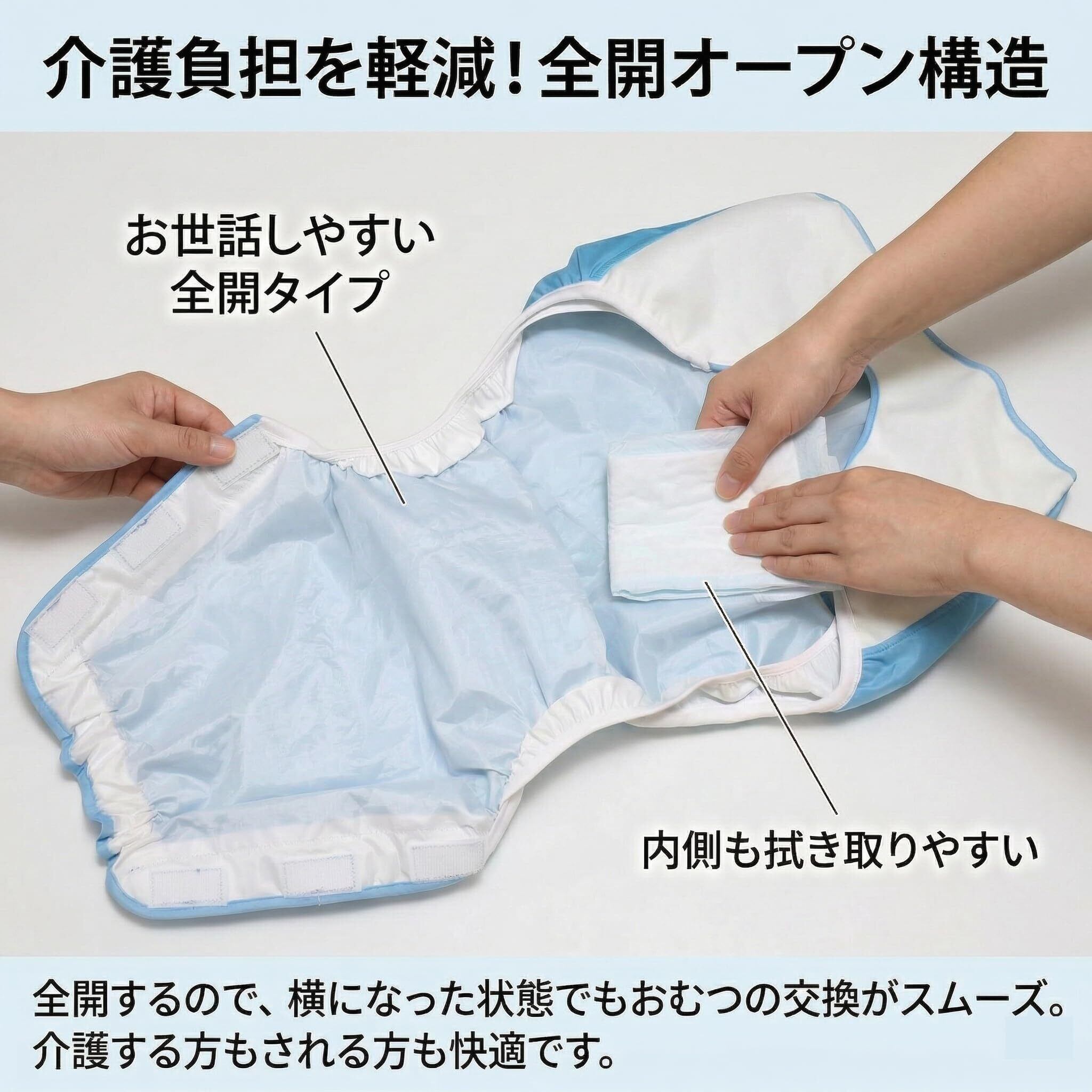[特徴] お世話しやすい全開オープンタイプ。漏れ防止の股ぐりギャザー。広いマジックテープ接着面のためサイズ適応範囲が広いです。