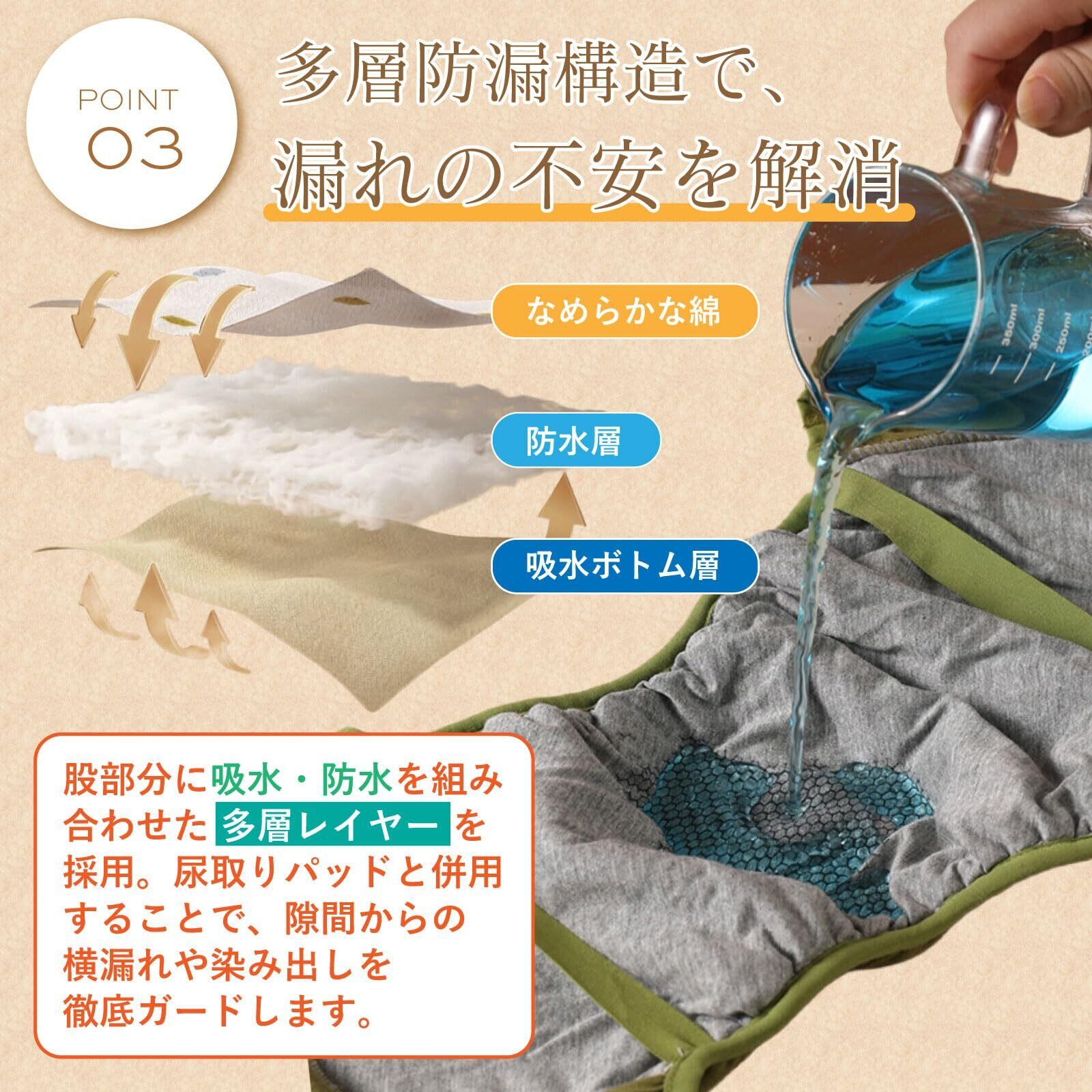本商品は尿取りパッド対応設計。市販の尿取りパッドや紙おむつと併用することで、ズレや横漏れを抑え、衣類や寝具への影響を軽減します。単体での完全吸収を目的としたものではなく、「漏れを防ぐためのサポートパンツ」として設計されているため、軽度から中度の失禁対策に取り入れやすく、日常生活に無理なくなじみます。