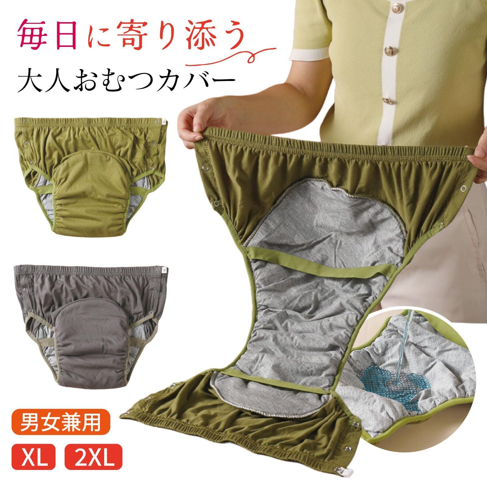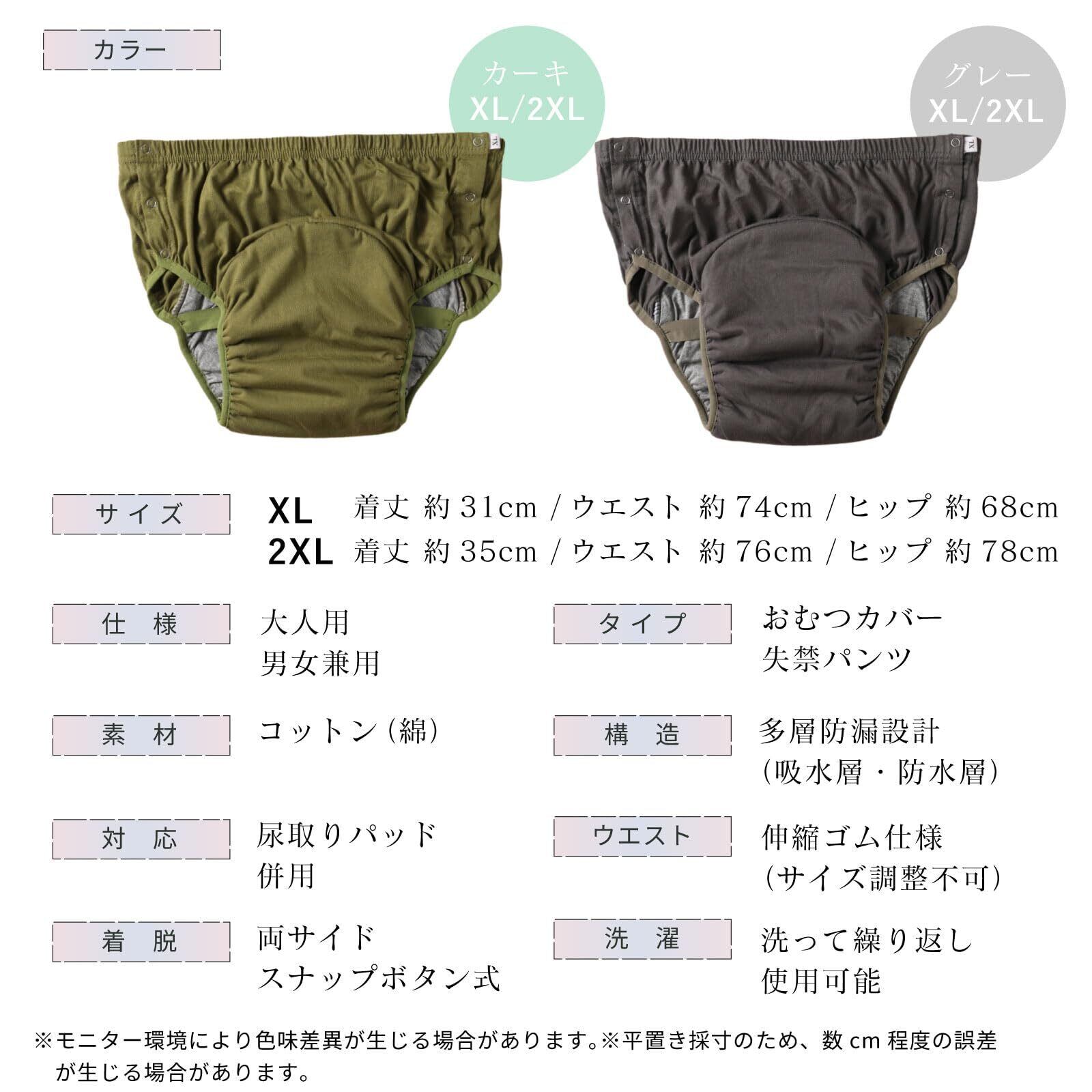 【商品仕様】大人用・男女兼用/タイプ:おむつカバー・失禁パンツ/素材:コットン(綿)/構造:多層防漏設計(吸水層・防水層)/対応:尿取りパッド併用/ウエスト:伸縮ゴム仕様(サイズ調整不可)/着脱:両サイドスナップボタン式/洗濯:洗って繰り返し使用可能/ 【サイズ】 XL:着丈 約31cm/ウエスト 約74cm/ヒップ 約68cm 2XL:着丈 約35cm/ウエスト 約76cm/ヒップ 約78cm ※平置き採寸のため、数cm程度の誤差が生じる場合があります。 ※モニター環境により実際の色味と異なって見える場合があります。