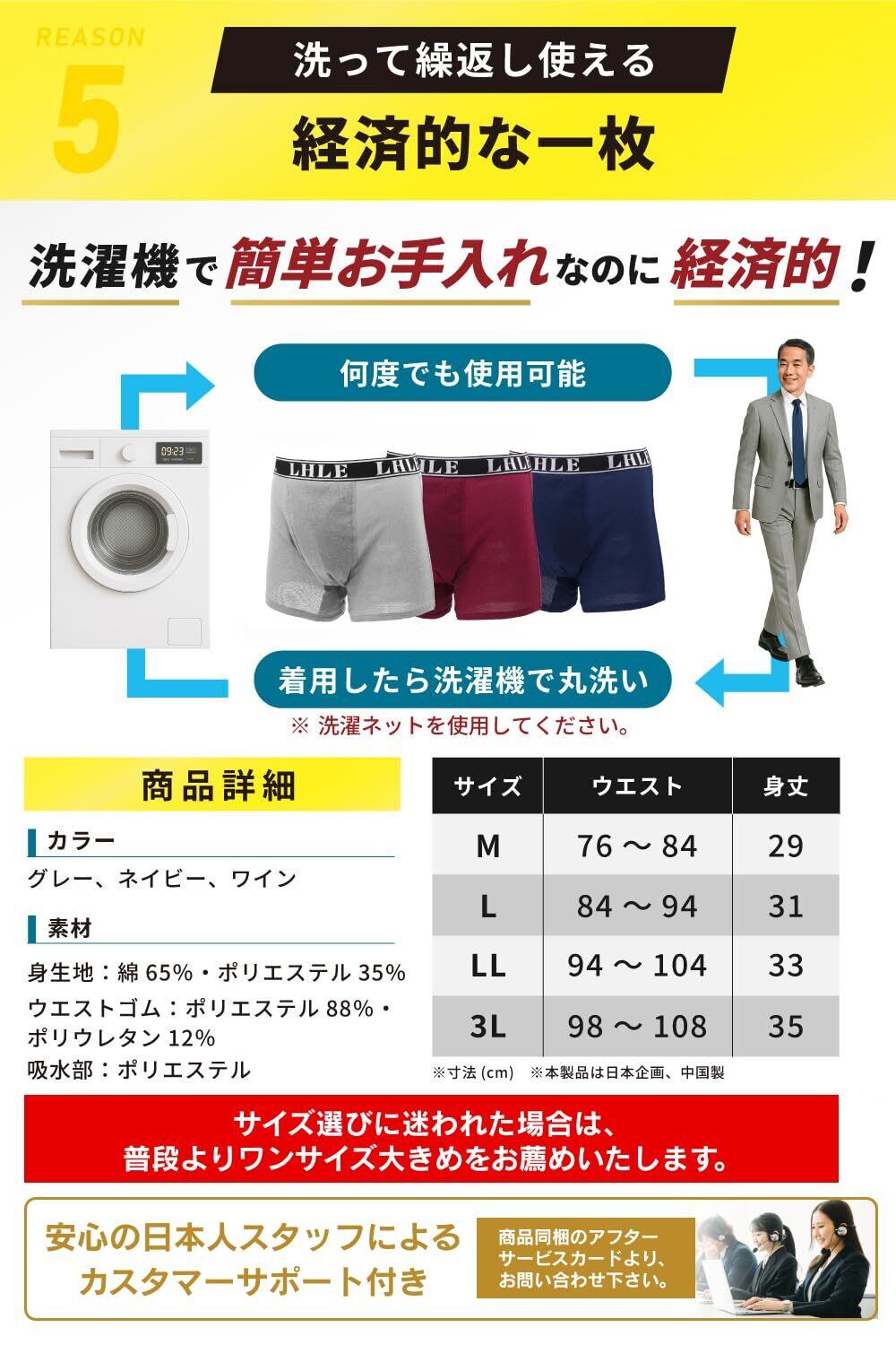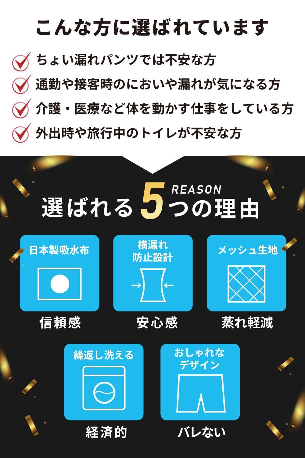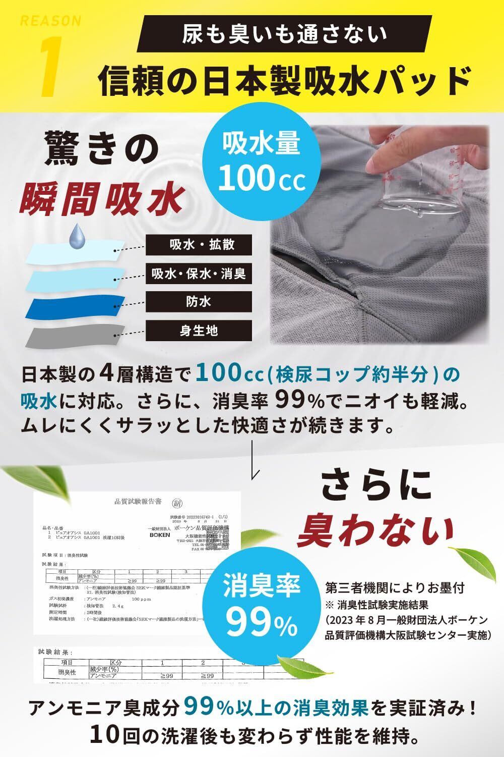 【尿も臭いも通さない信頼の日本製吸水パッド】 日本製の4層構造で100cc(検尿コップ約半分)の吸水に対応するにょうもれ男性用パンツです。消臭率99%でニオイも軽減。ムレにくくサラッとした快適さが続きます。