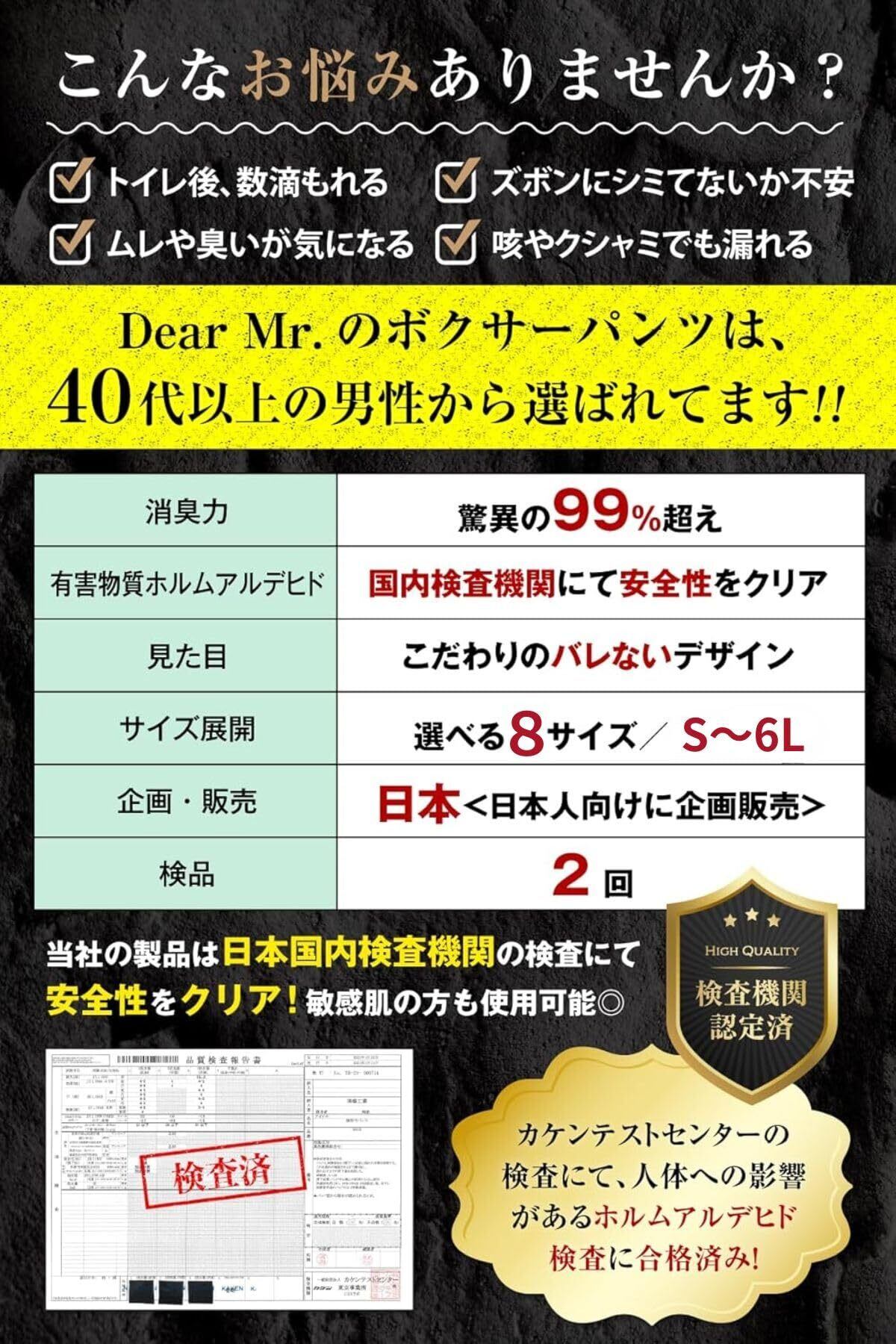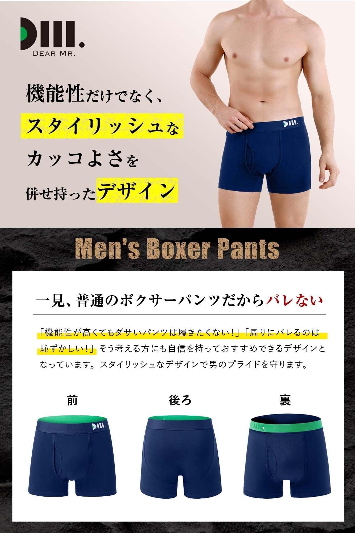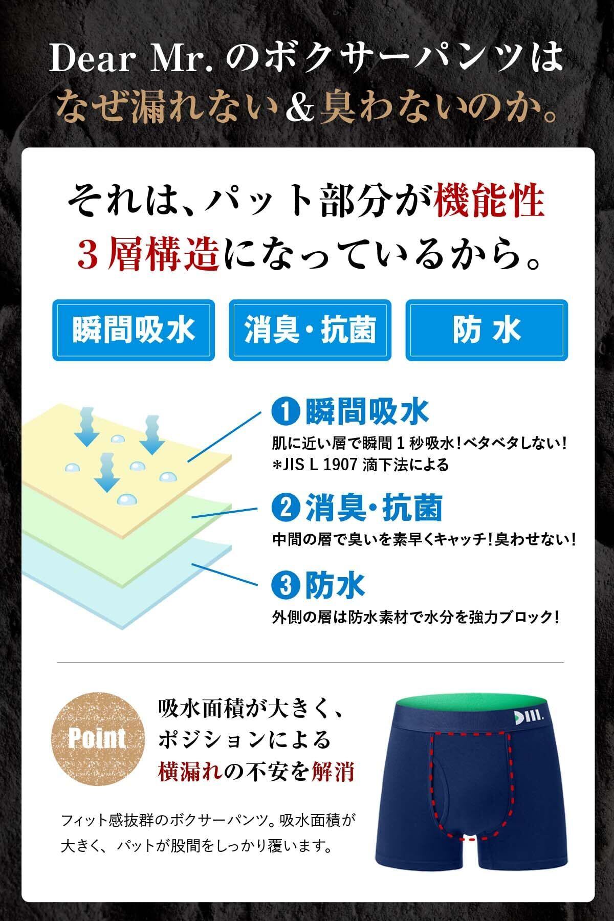 【ちょい漏れがズボンに染みない!】こんな尿のお悩みありませんか?「残尿でズボンにシミができる」「ムレや臭いが気になる」「咳やクシャミでも漏れる」そんなお悩みを解決するのがDear Mr.のメンズボクサーパンツ。吸水スピード1秒以下で、“ちょい漏れ”や“追っかけ漏れ”を瞬間吸水!また、消臭力99%以上で消臭抗菌作用もあります。吸水面積が大きく、ポジションによる横漏れの不安を解消。