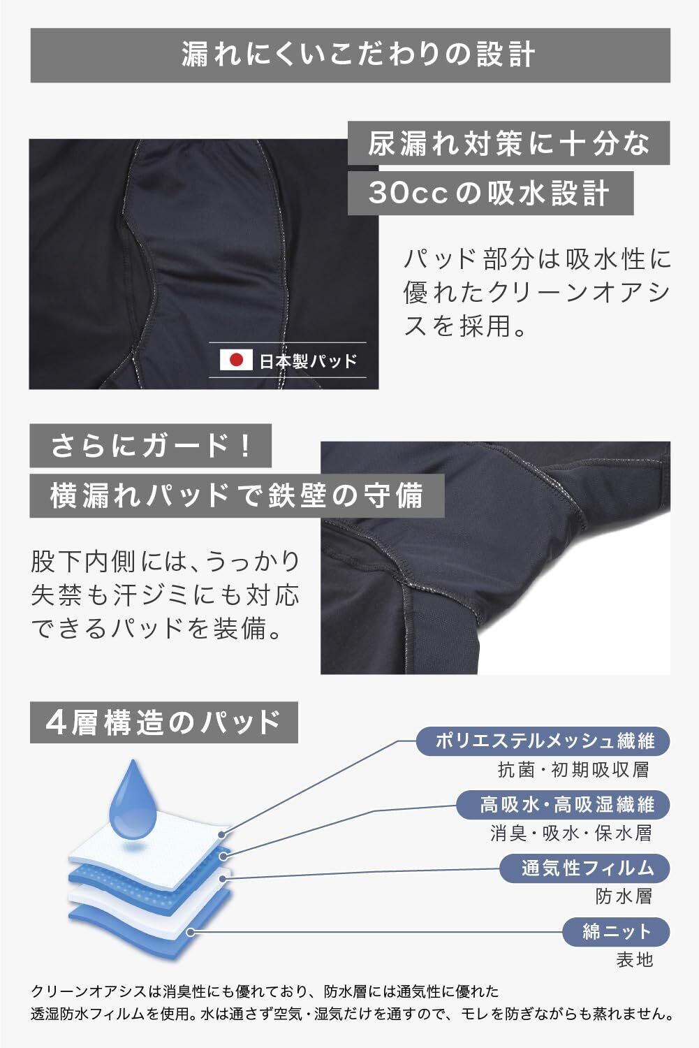【安心の吸水力&日本製パッド】 30cc対応の吸水パッドには、日本製の高品質素材「クリーンオアシス」を採用。吸水性に優れ、心配な「ちょい漏れ」をしっかりキャッチ。外出時やアクティブなシーンでも、一日中安心してお使いいただけます。