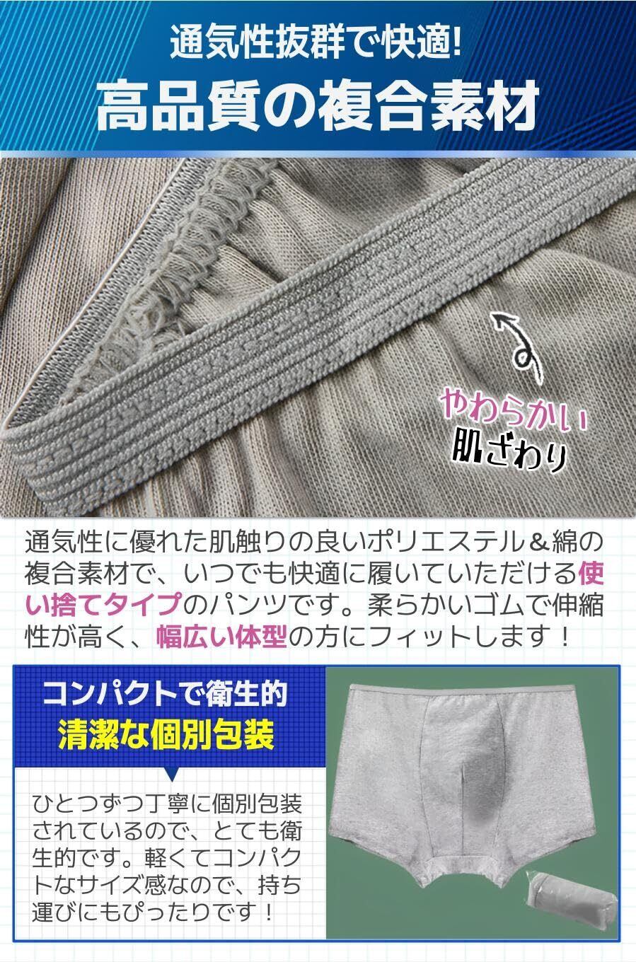 【高品質の複合素材】通気性に優れた肌触りの良いポリエステル&綿の複合素材で、いつでも快適に履いていただける使い捨てタイプのパンツです。柔らかいゴムで伸縮性が高く、締め付け感も無いため幅広い体型の方にフィットします!