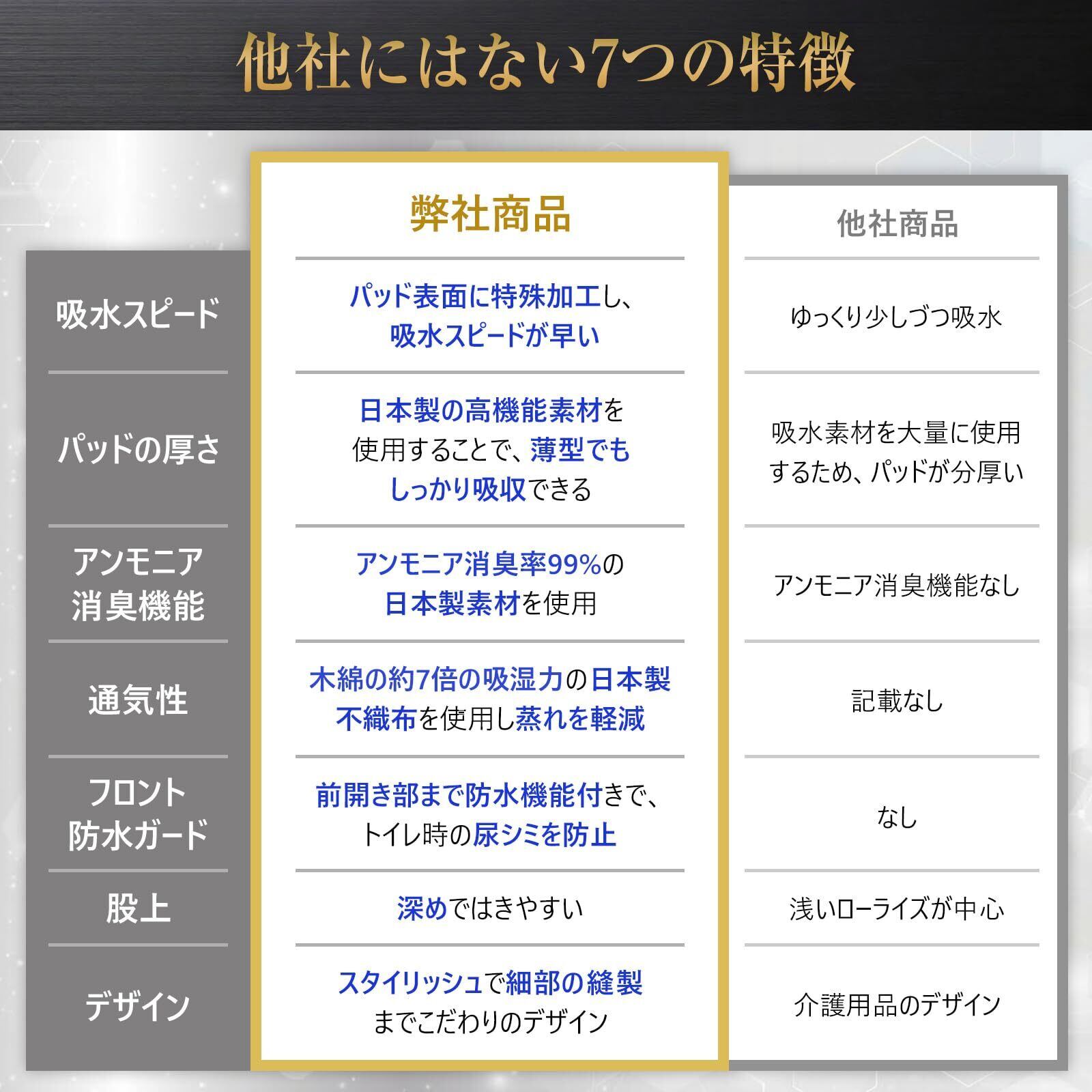 通気性に優れた、肌さわりの良いメッシュ生地を採用。深めの股上とゆったりデザインで安心のはき心地。見た目にもスマートな、吸水・消臭パンツ。 「残尿が気になる」「尿シミができてしまう」「ニオイが不安」「トイレに間に合わない」 そんなお悩みを抱える方に。 大切なイベントや外出先でも、自信を持って過ごせる安心の一枚です。
