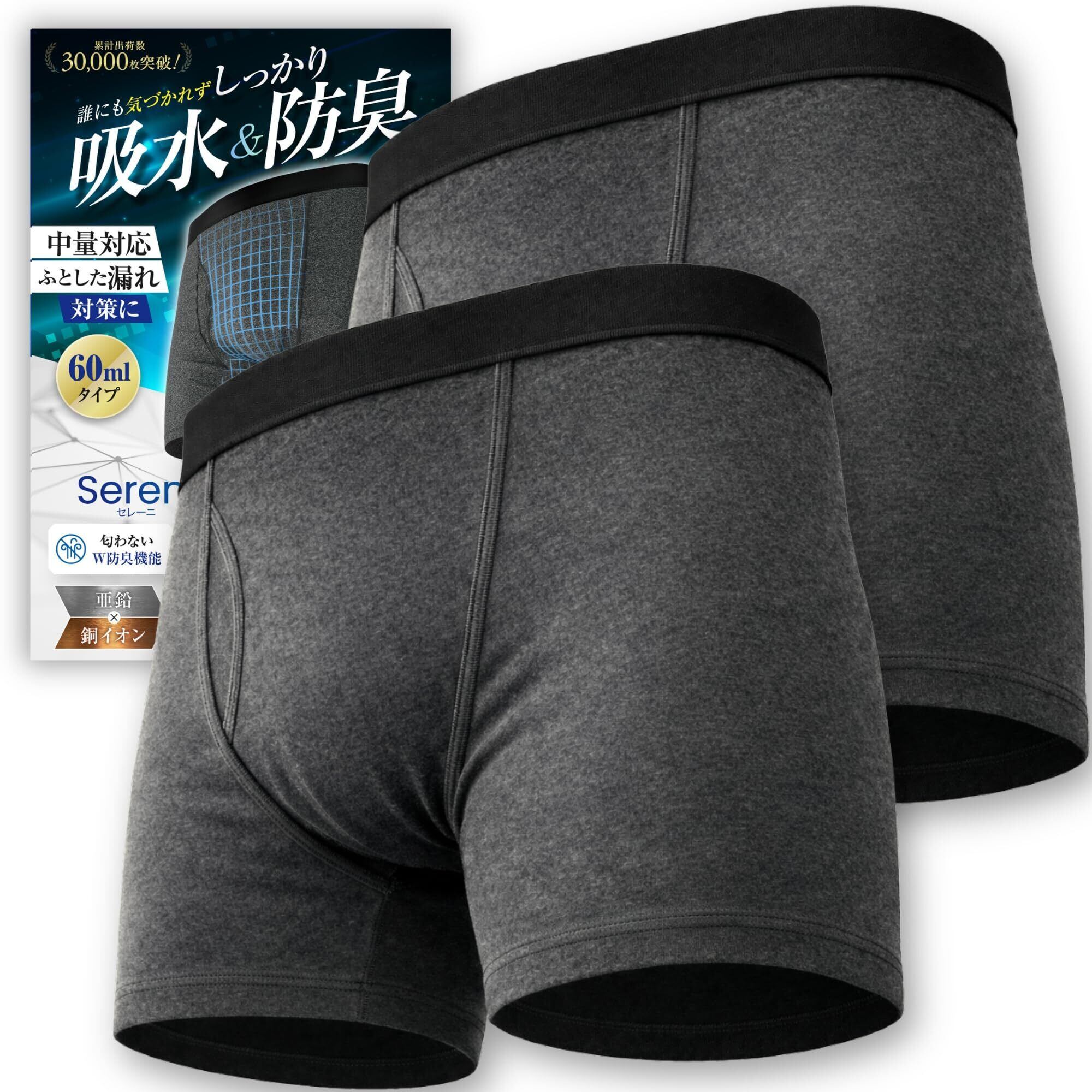 にょうもれ 男性用 パンツ 60ml 前開き 尿漏れパンツ 失禁パンツ 紳士 ボクサーパンツ 吸水パンツ セレーニ 2枚セット (チャコール L)