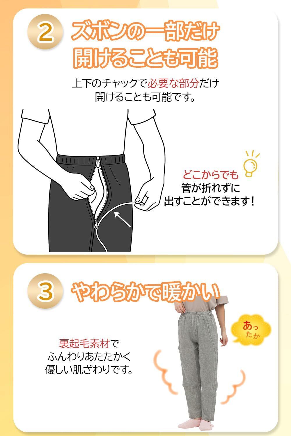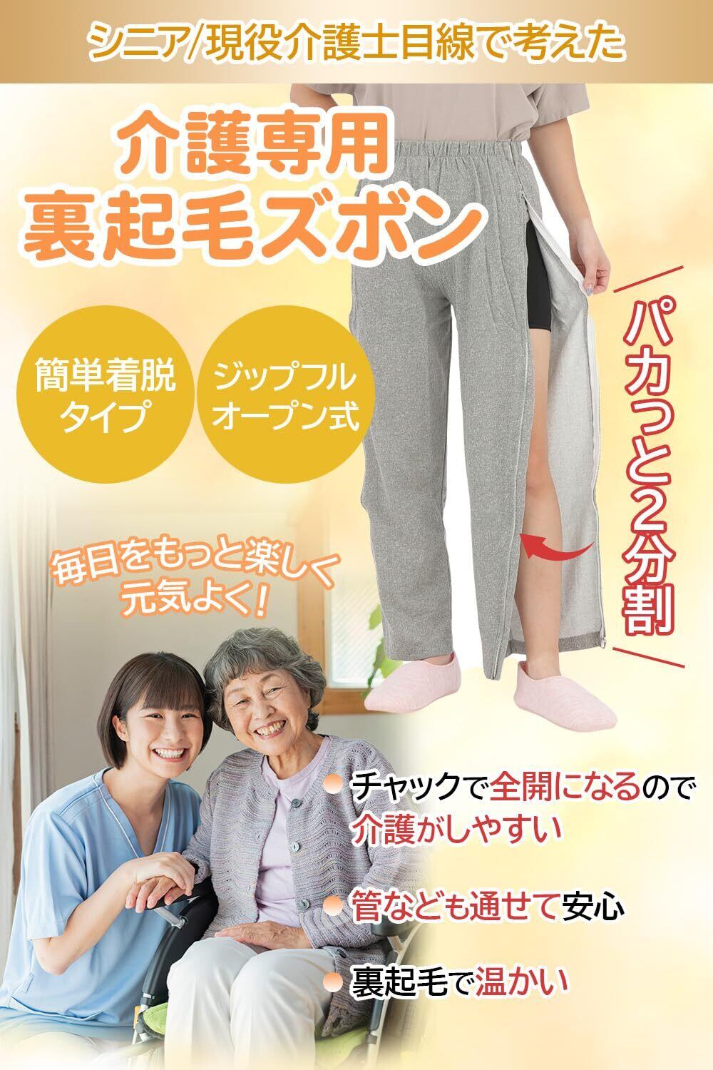 ① 両サイドがフルオープンで着脱がとても簡単:ズボンの左右に長いファスナーが付いているので、立ったままでも、座ったままでも、寝たままでも 着替えができます。介護する側の負担がぐっと軽くなります。